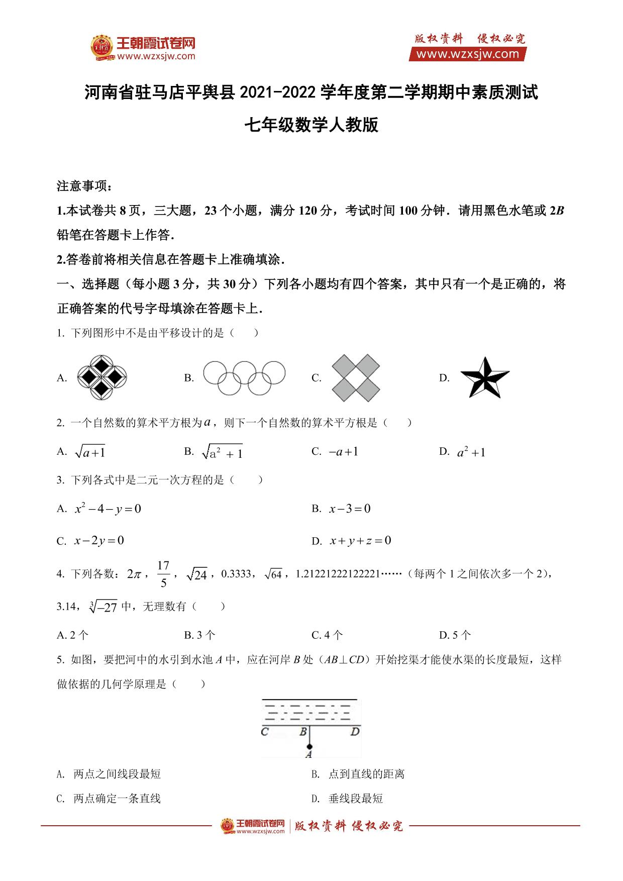 河南省驻马店市平舆县2021-2022学年度第二学期期中素质测试七年级数学(人教版)