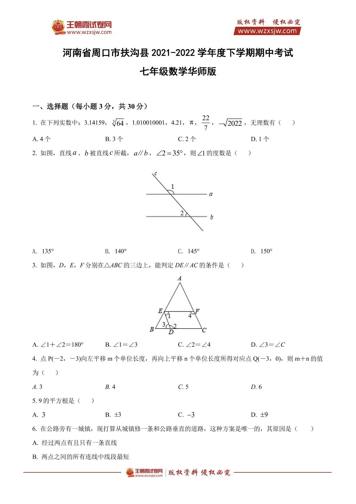 河南省周口市扶沟县2021-2022学年度下学期期中考试七年级数学(华师版)