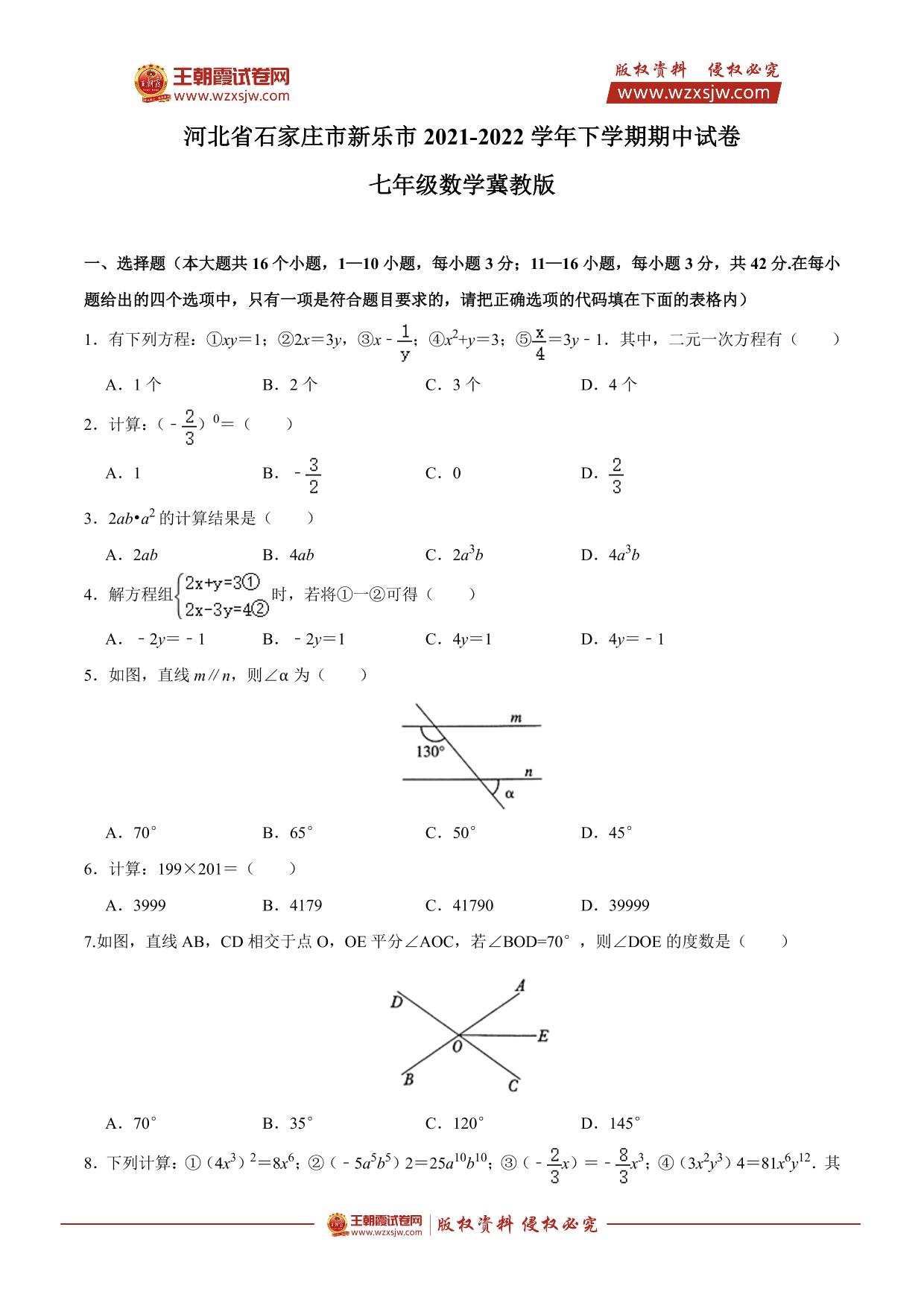 河北省石家庄市新乐市2021-2022学年下学期期中试卷七年级数学(冀教版)