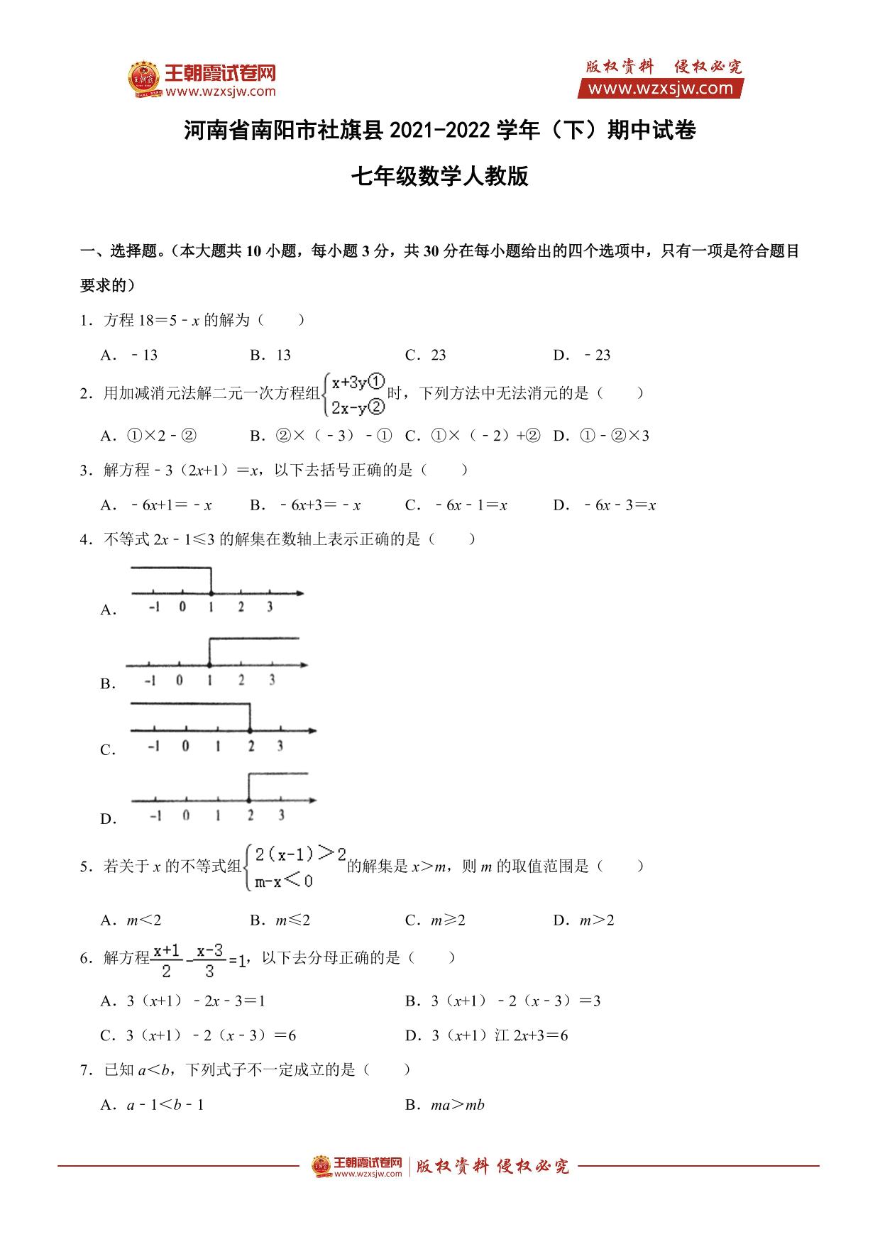 河南省南阳市社旗县2021-2022学年(下)期中试卷七年级数学(人教版)