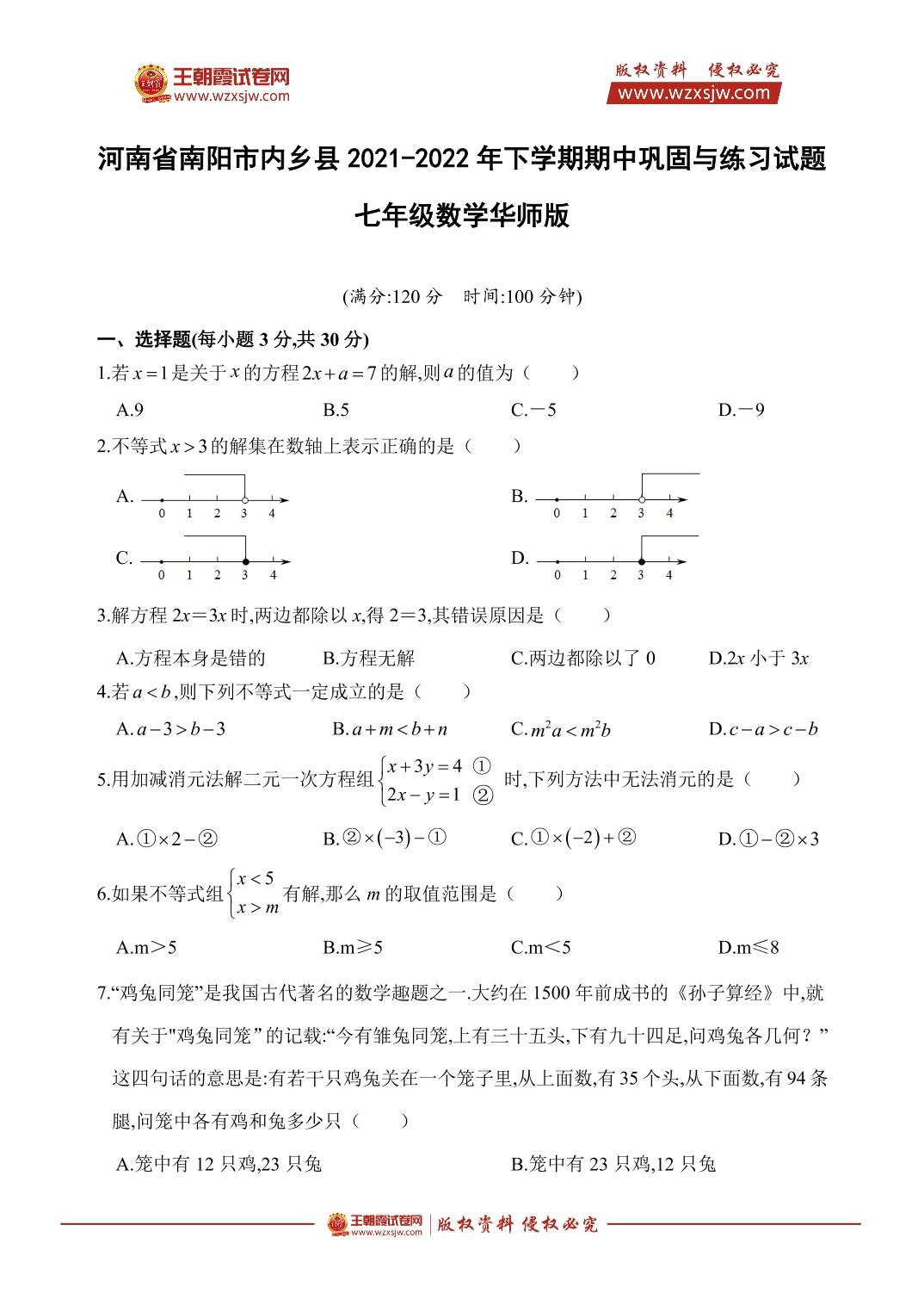 河南省南阳市内乡县2021-2022学年下学期期中巩固与练习试题七年级数学(华师版)
