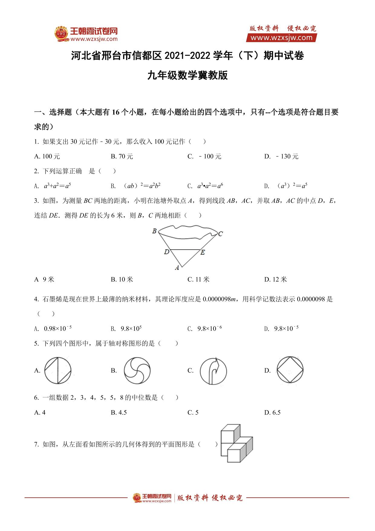 河北省邢台市信都区2021-2022学年(下)期中试卷九年级数学(冀教版)