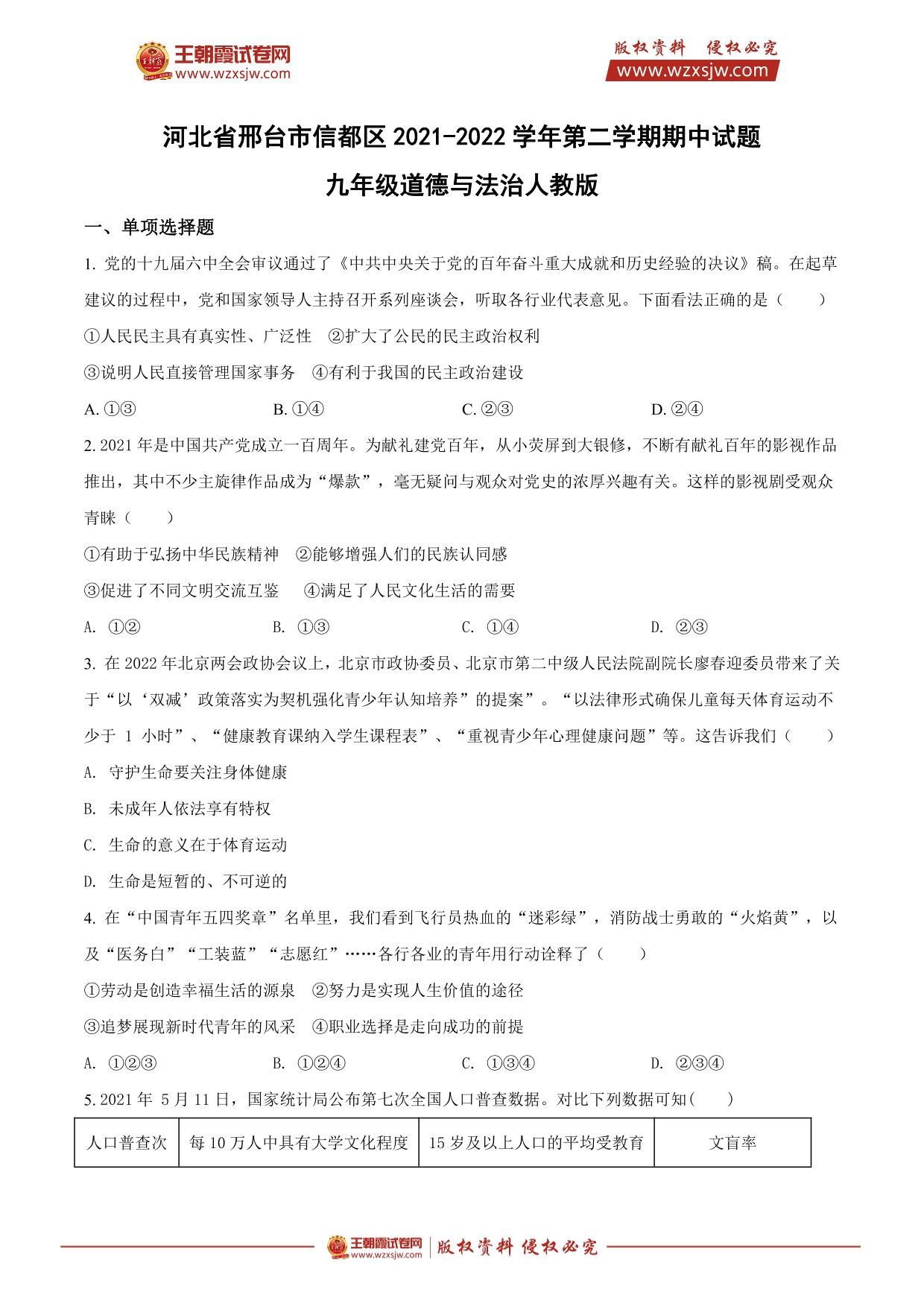 河北省邢台市信都区2021-2022学年第二学期期中试题九年级道德与法治(人教版)
