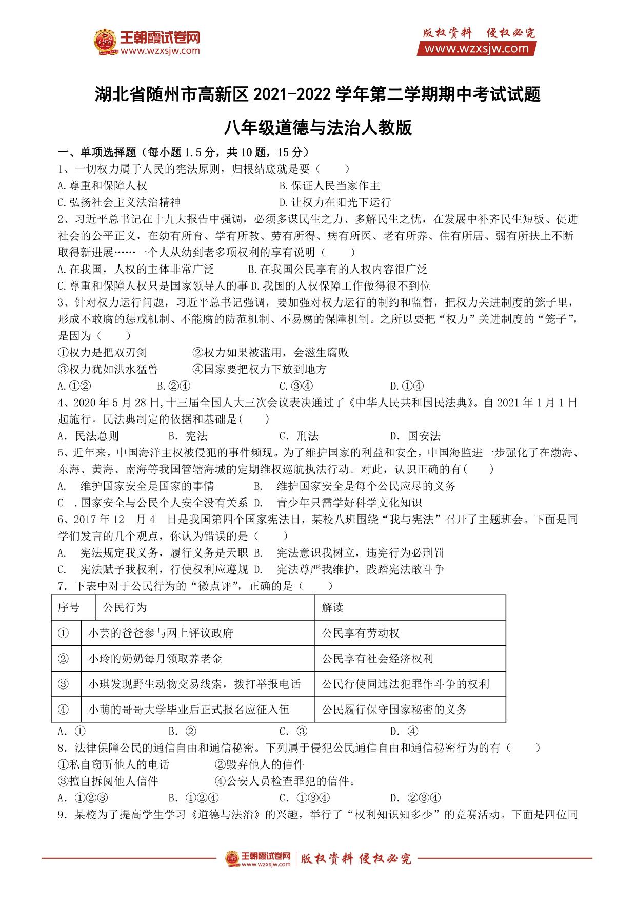 湖北省随州市高新区2021-2022学年第二学期期中考试试题八年级道德与法治(人教版)