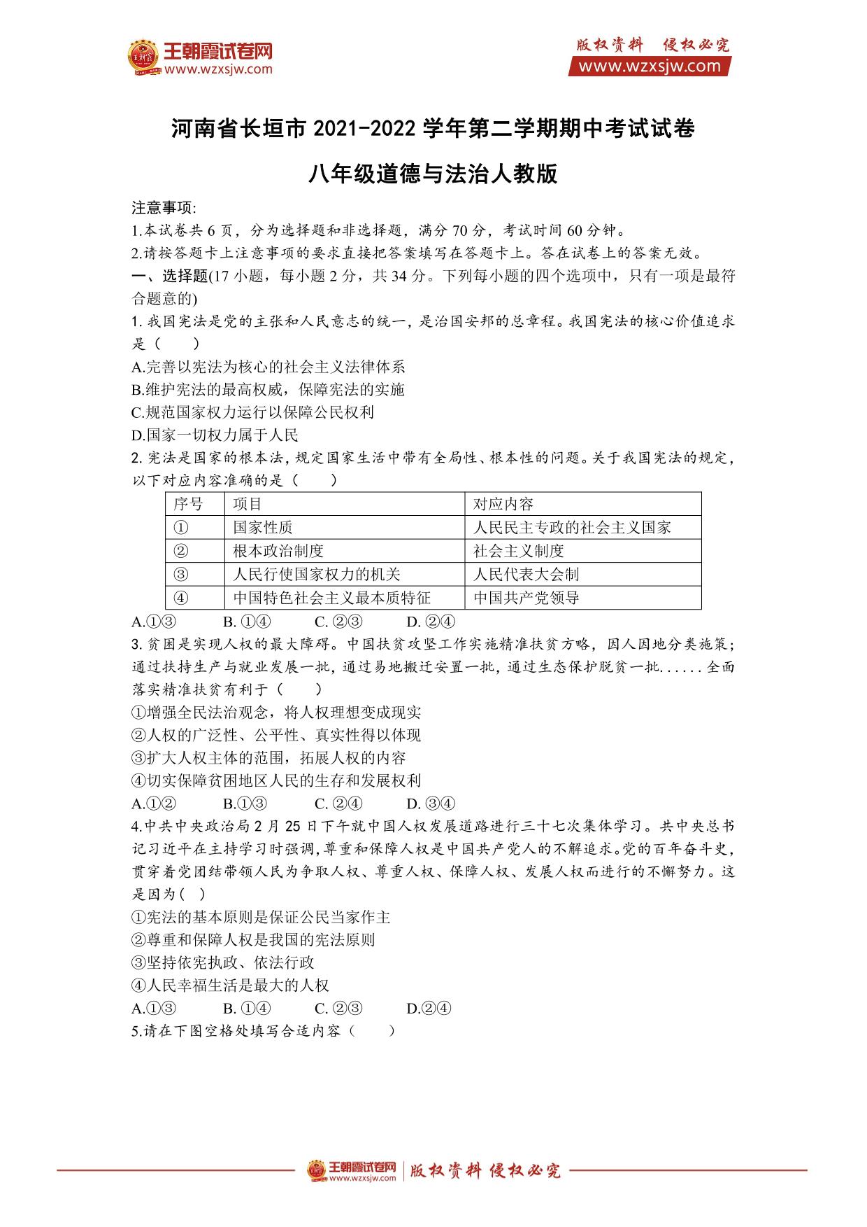 河南省长垣市2021-2022学年第二学期期中考试试卷八年级道德与法治(人教版)