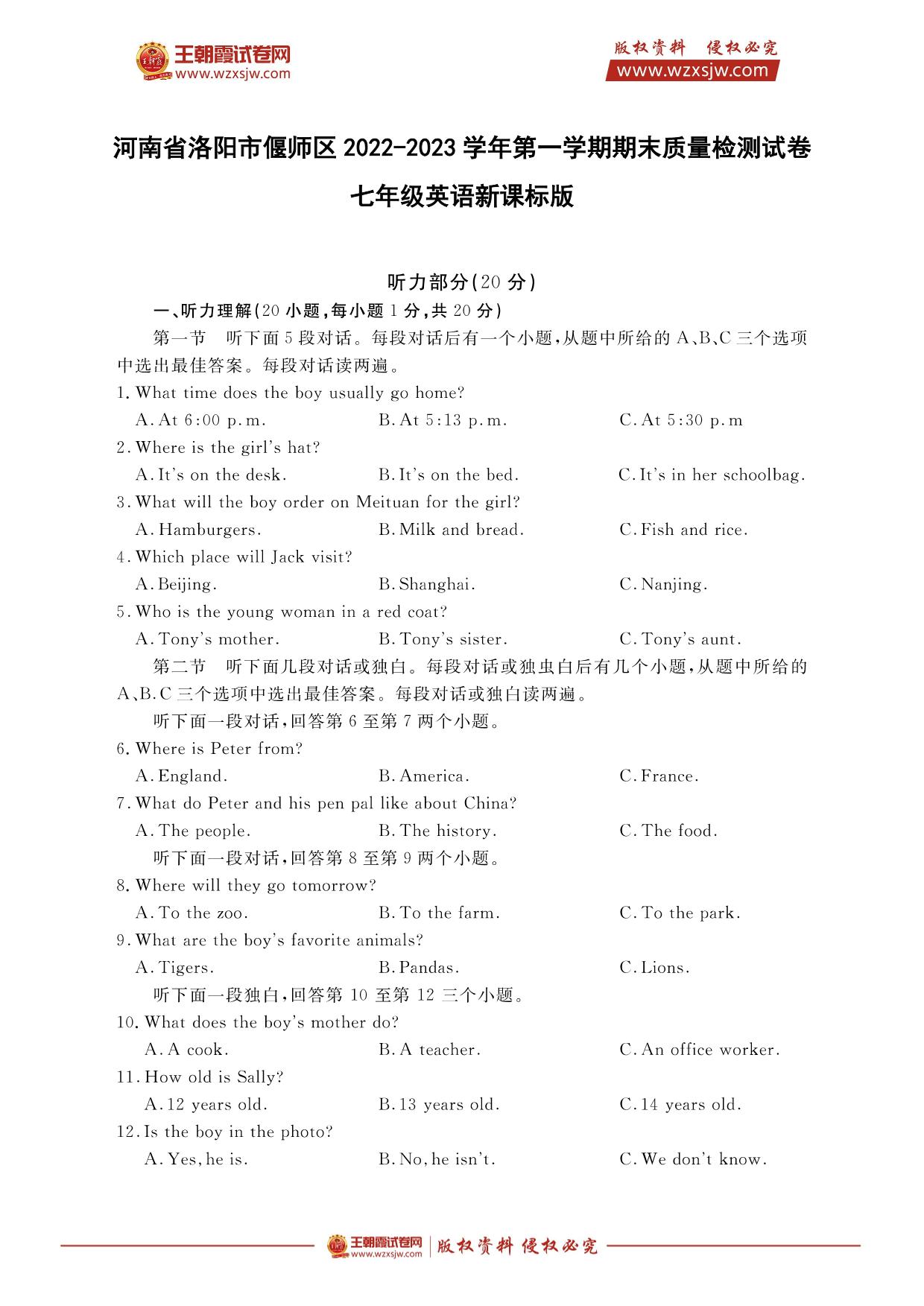 河南省洛阳市偃师区2022-2023学年第一学期期末质量检测试卷七年级英语(新课标版)【无听力音频】