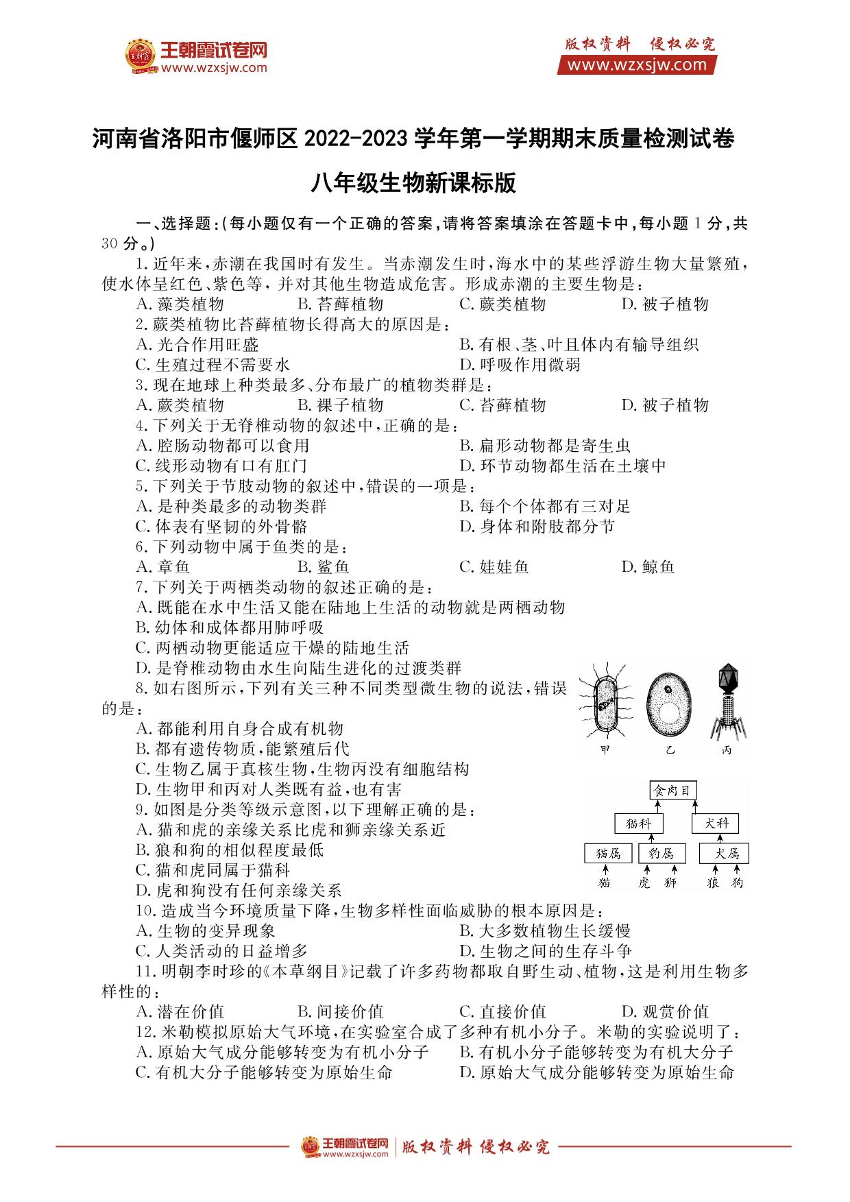 河南省洛阳市偃师区2022-2023学年第一学期期末质量检测试卷八年级生物(新课标版)