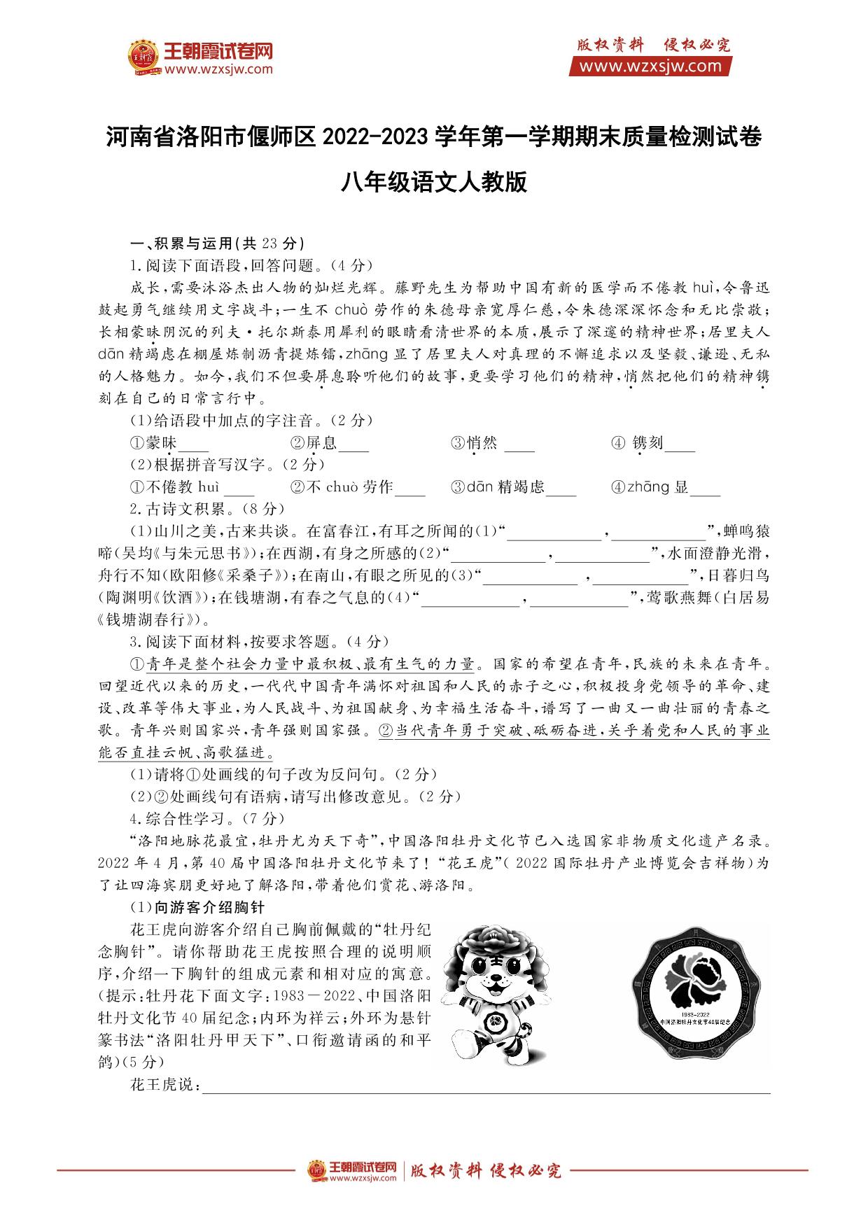 河南省洛阳市偃师区2022-2023学年第一学期期末质量检测试卷八年级语文(人教版)