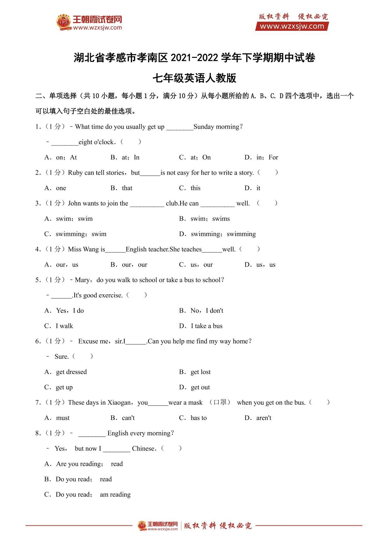 湖北省孝感市孝南区2021-2022学年下学期期中试卷七年级英语(人教版)【无听力音频】