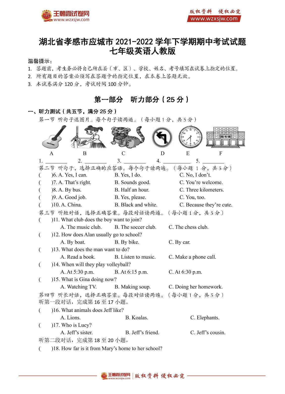 湖北省孝感市应城市2021-2022学年下学期期中考试试题七年级英语(人教版)【无听力音频】