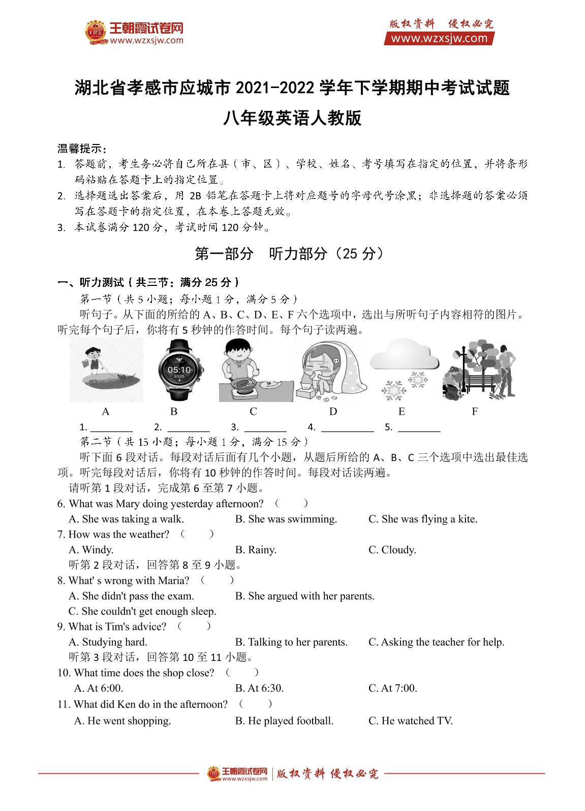 湖北省孝感市应城市2021-2022学年下学期期中考试试题八年级英语(人教版)【无听力音频】
