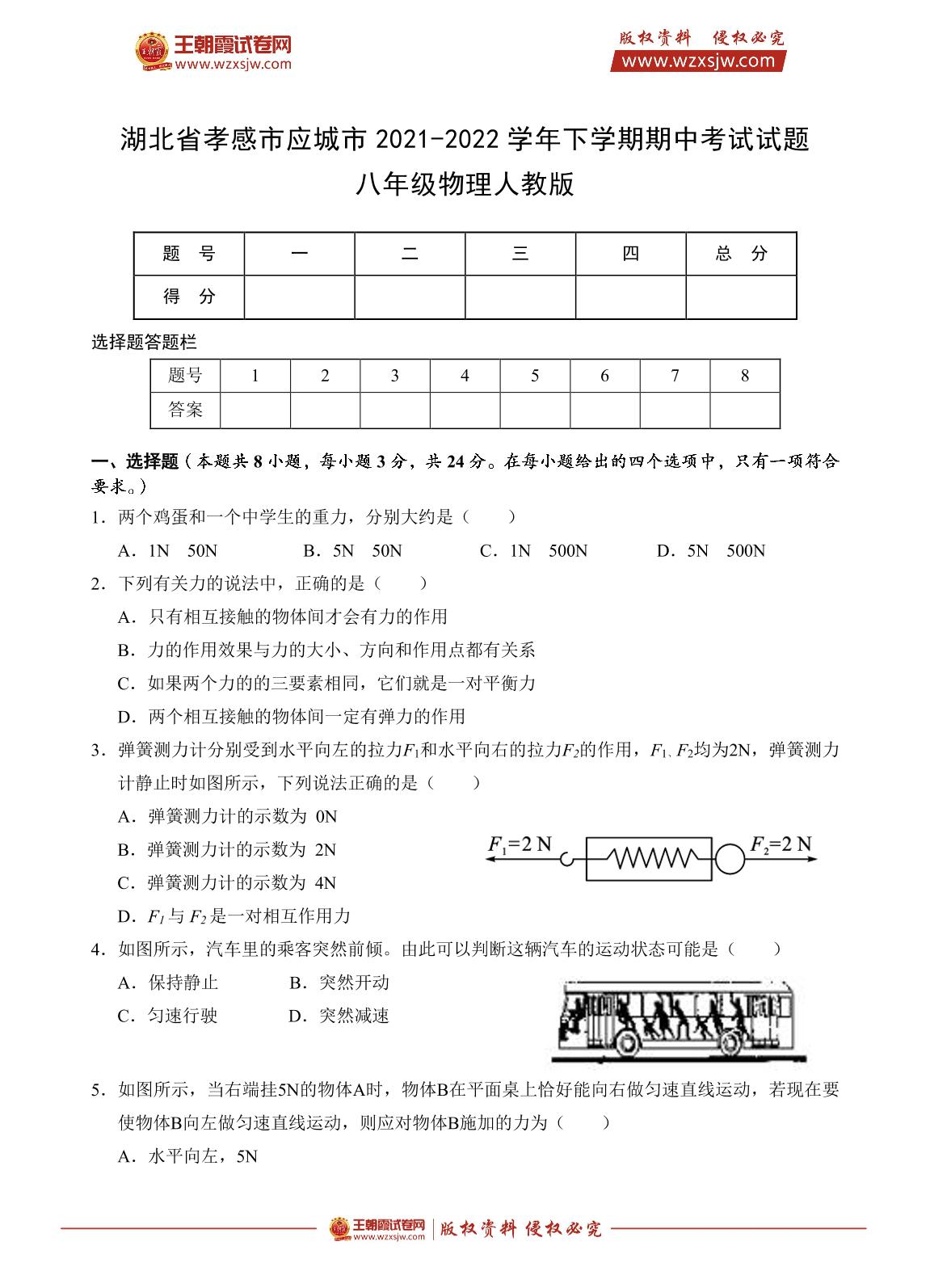 湖北省孝感市应城市2021-2022学年下学期期中考试试题八年级物理(人教版)