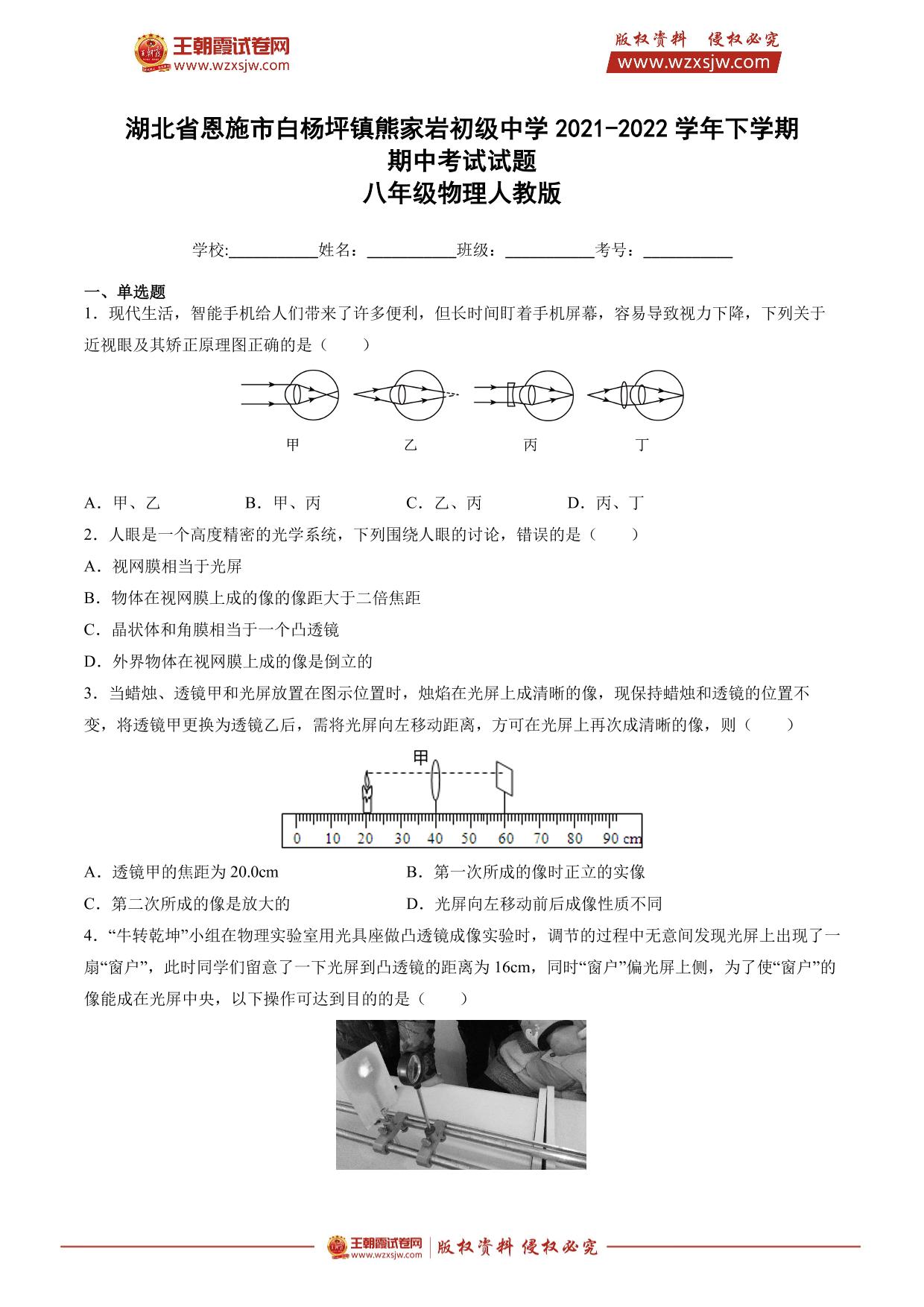 湖北省恩施市白杨坪镇熊家岩初级中学2021-2022学年下学期期中考试试题八年级物理(人教版)