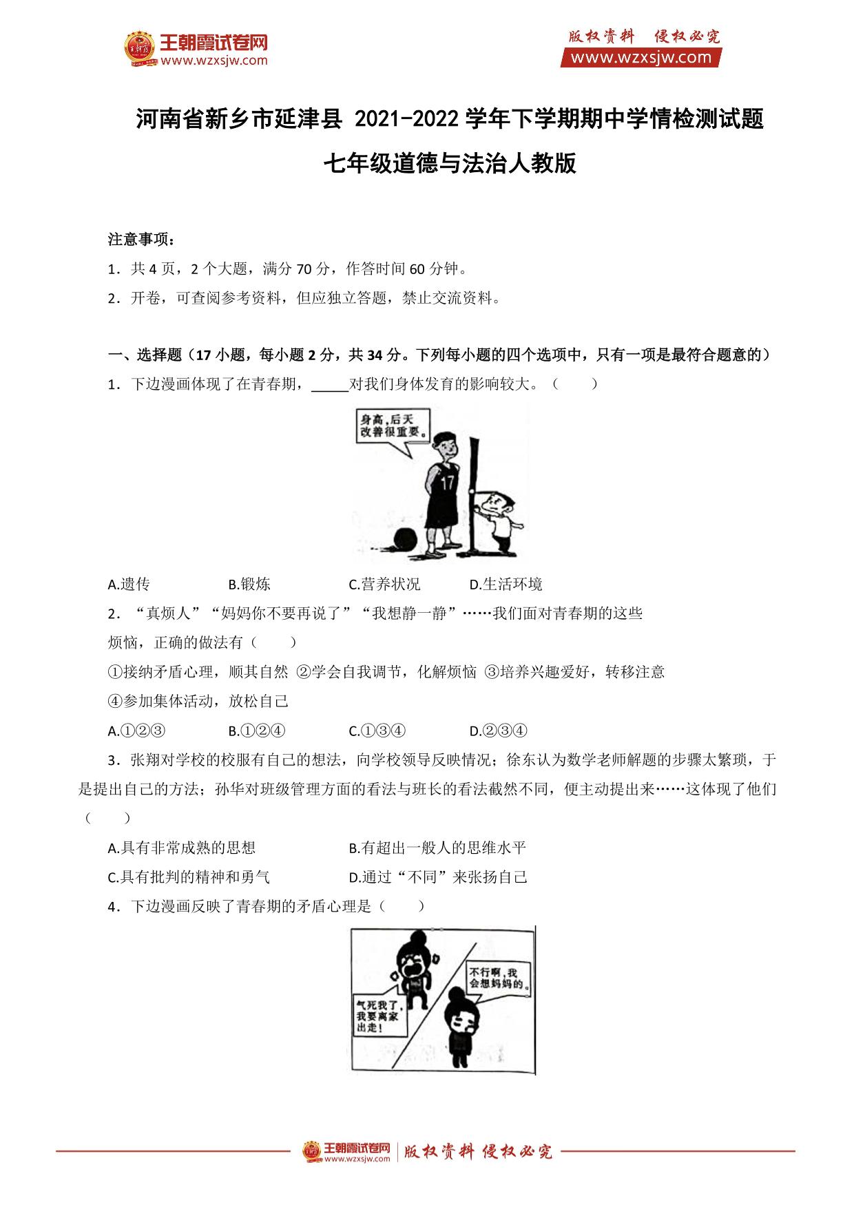 河南省新乡市延津县 2021-2022学年下学期期中学情检测试题七年级道德与法治(人教版)