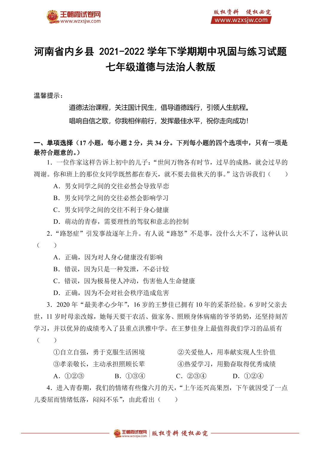 河南省内乡县 2021-2022学年下学期期中巩固与练习试题七年级道德与法治(人教版)