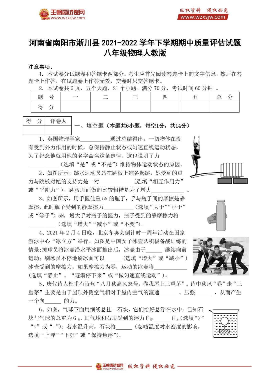 河南省南阳市淅川县2021-2022学年下学期期中质量评估试题八年级物理(人教版)