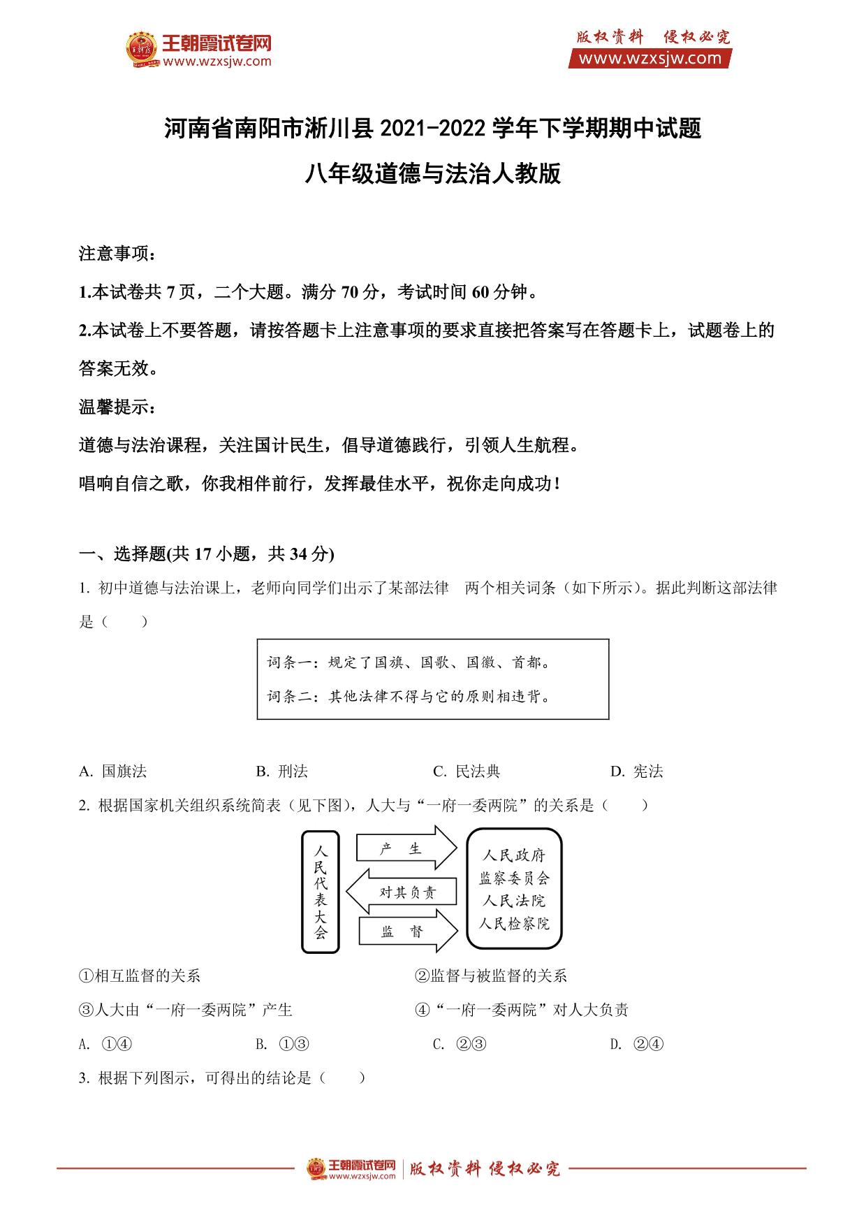 河南省南阳市淅川县2021-2022学年下学期期中试题八年级道德与法治(人教版)