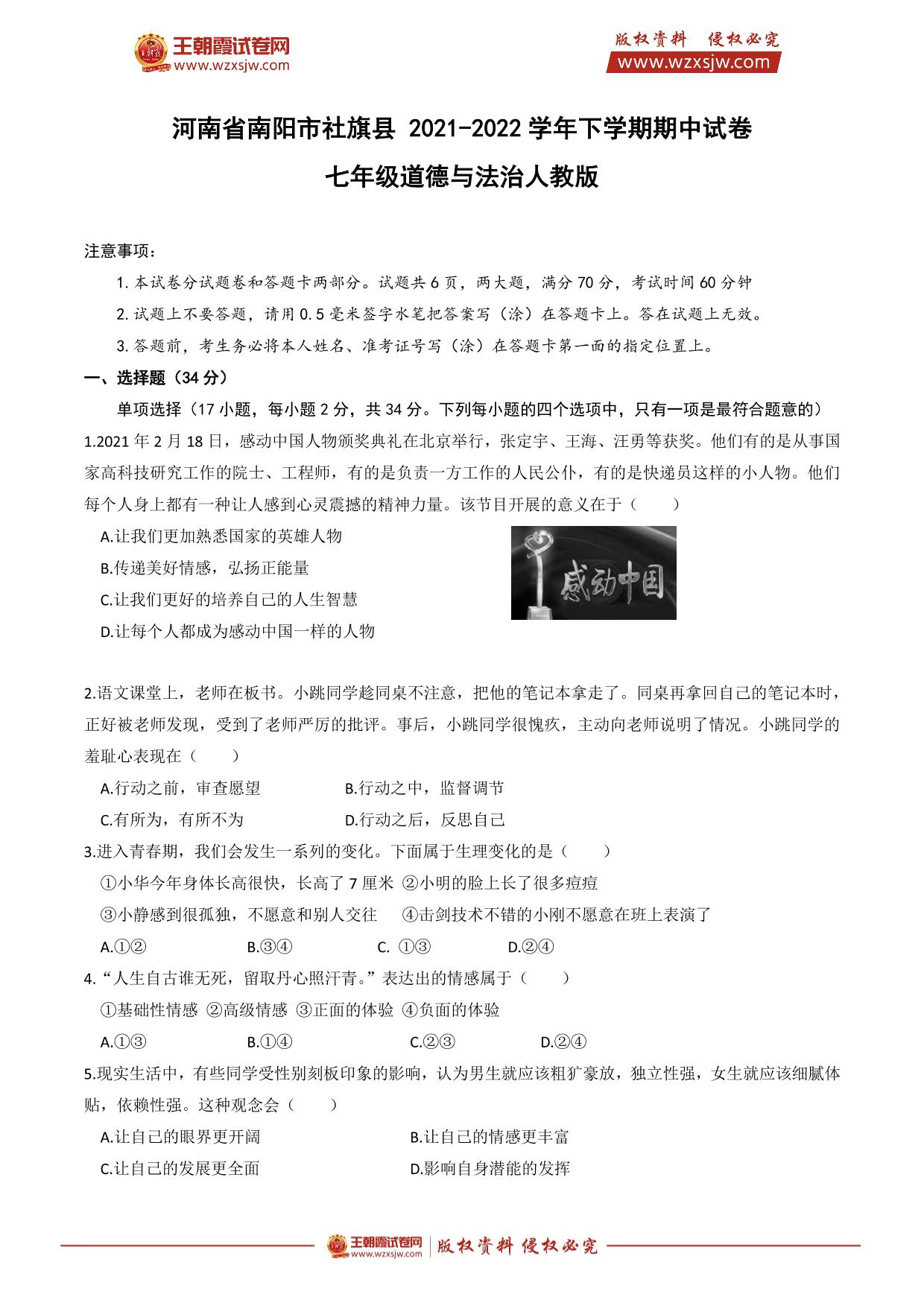 河南省南阳市社旗县 2021-2022学年下学期期中试卷七年级道德与法治(人教版)