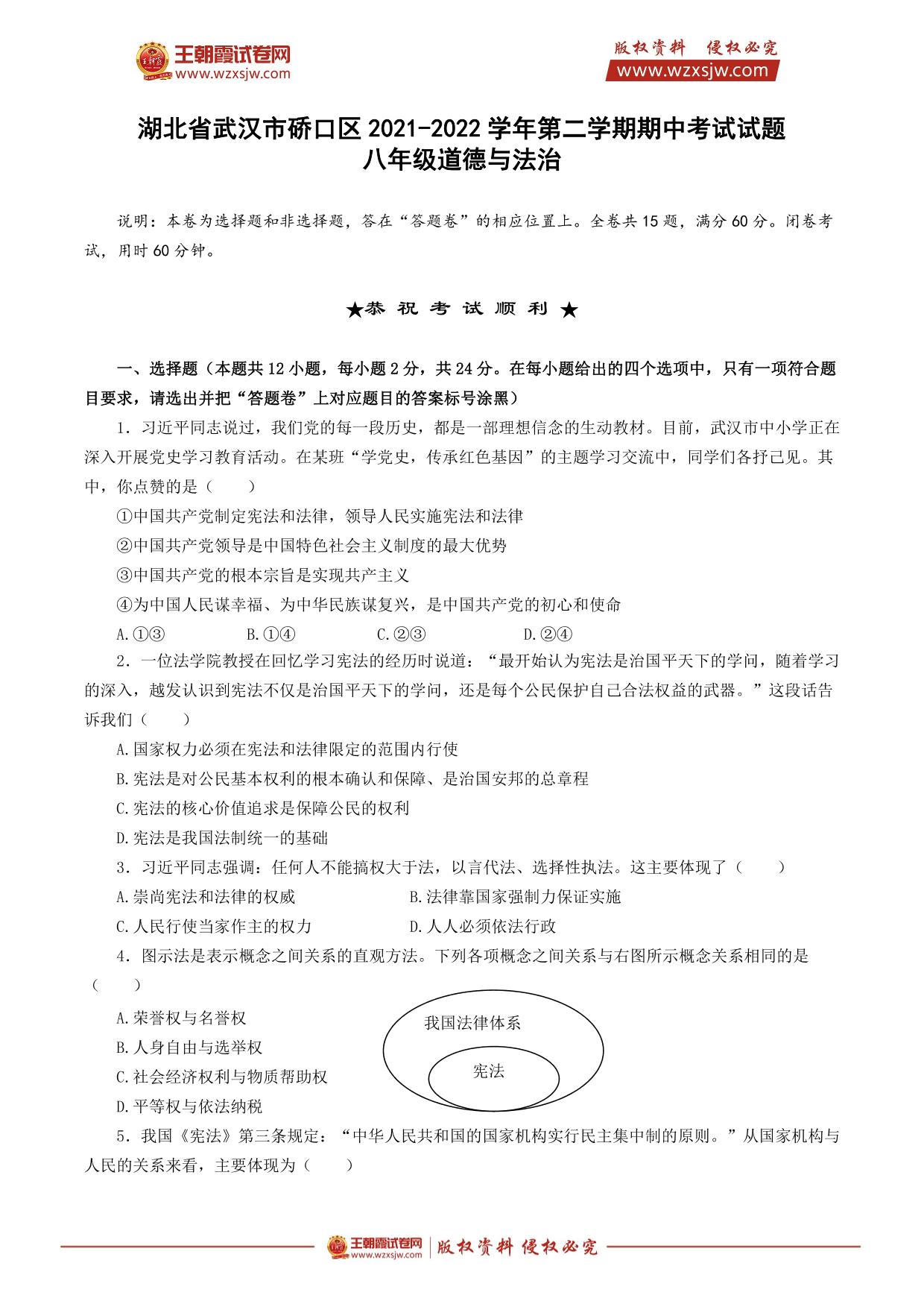 湖北省武汉市硚口区2021-2022学年第二学期期中考试试题八年级道德与法治