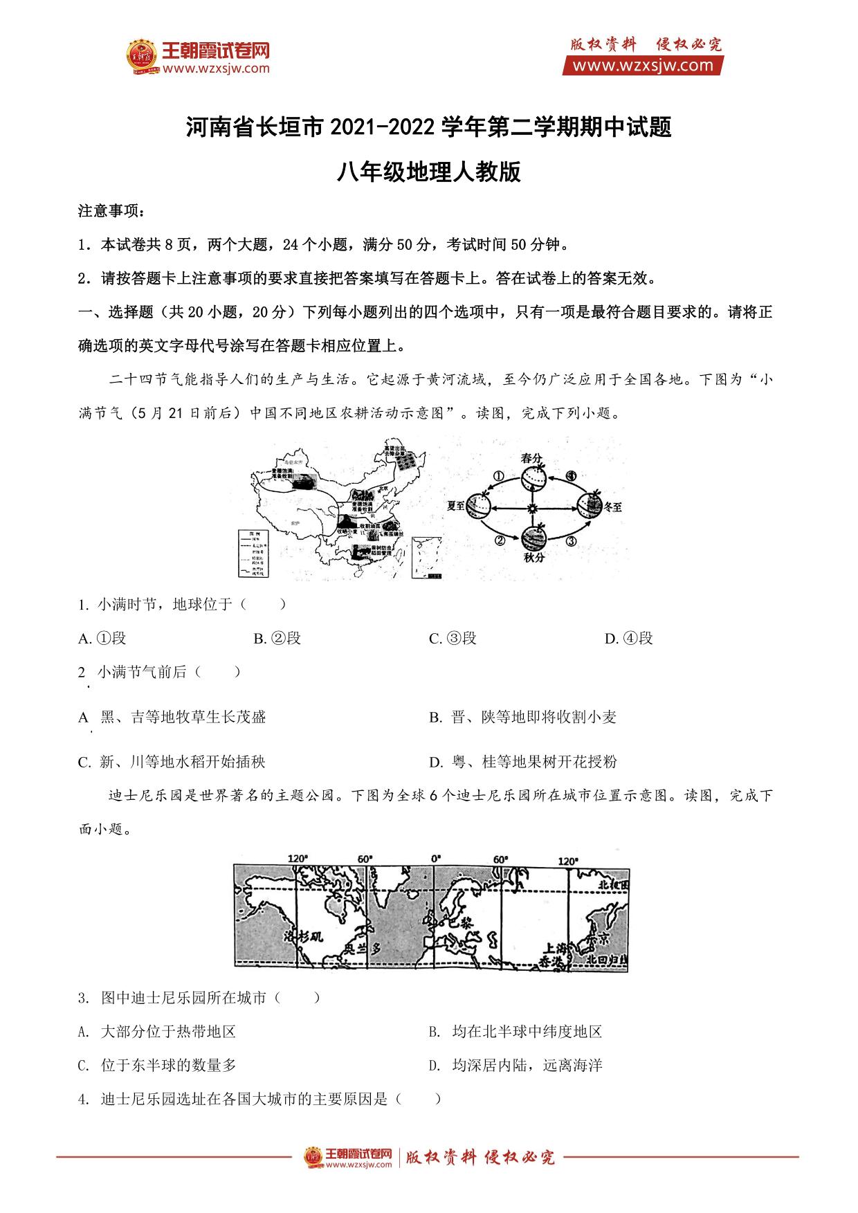 河南省长垣市2021-2022学年第二学期期中试题八年级地理(人教版)