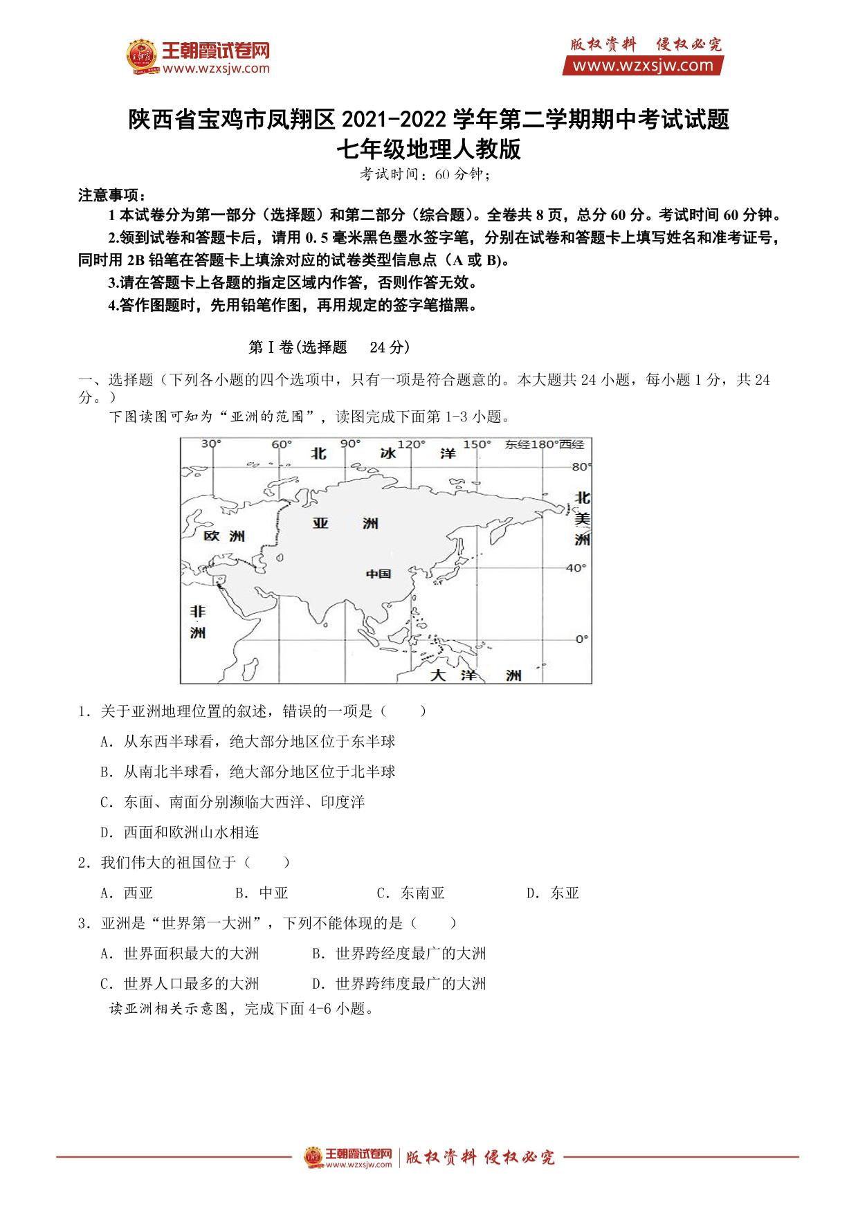 陕西省宝鸡市凤翔区2021-2022学年第二学期期中考试试题七年级地理(人教版)