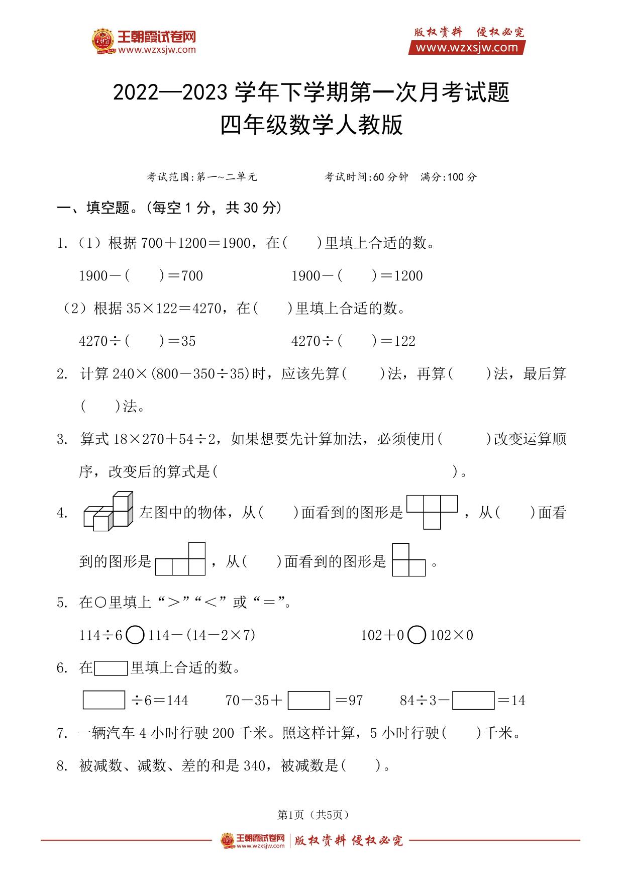 2022—2023学年下学期第一次月考试题四年级数学(人教版)