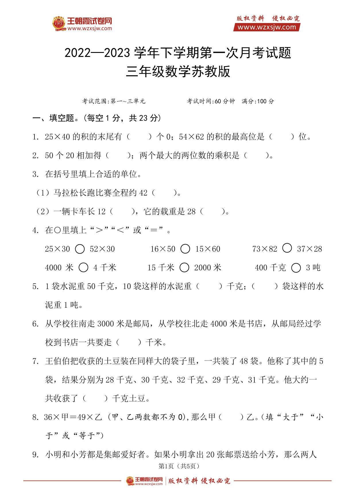 2022—2023学年下学期第一次月考试题三年级数学(苏教版)