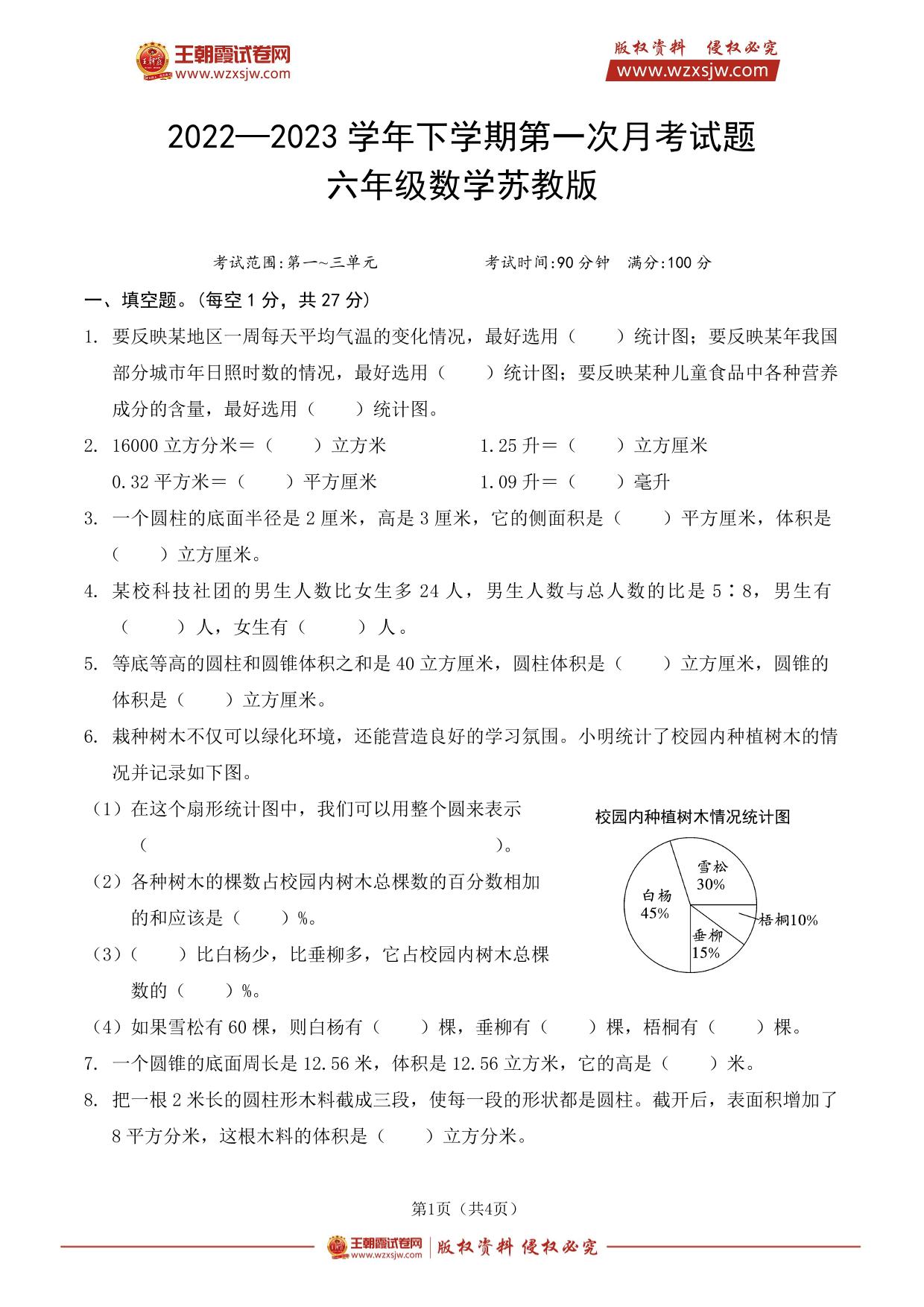 2022—2023学年下学期第一次月考试题六年级数学(苏教版)