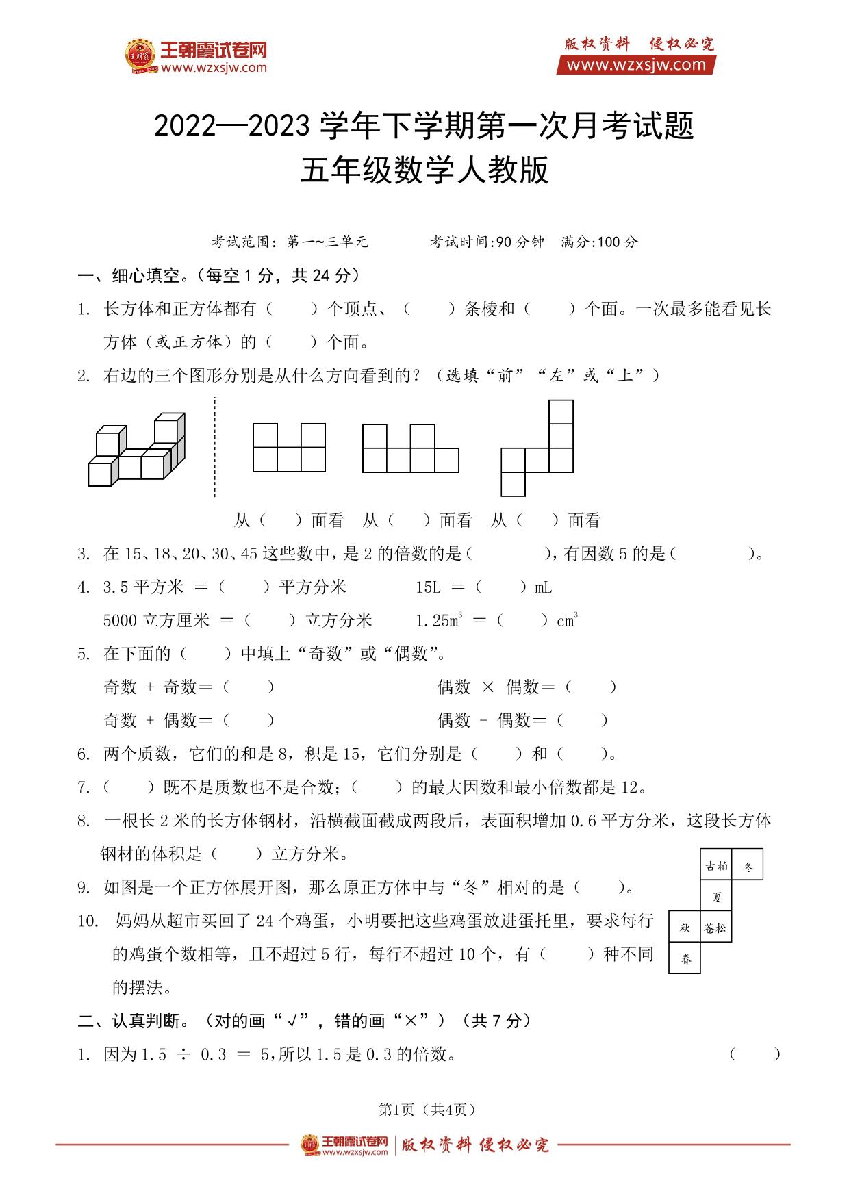2022—2023学年下学期第一次月考试题五年级数学(人教版)