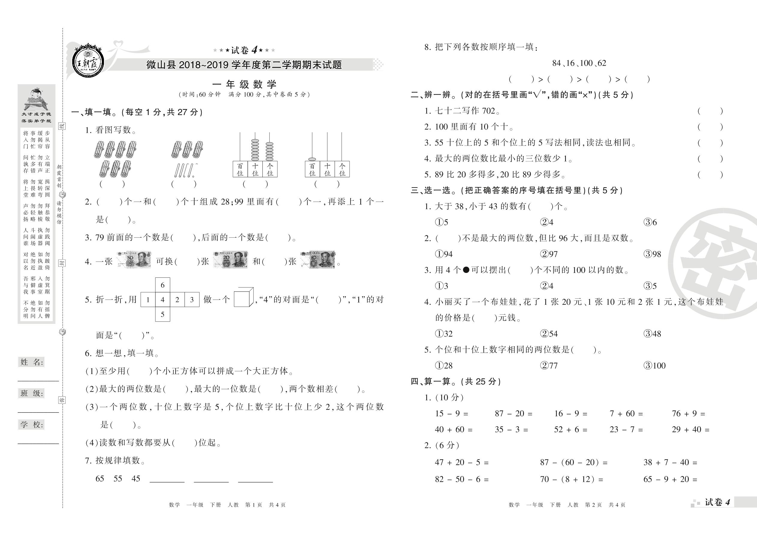2018-2019学年第二学期济宁市微山县一年级数学试卷(人教版)【4】