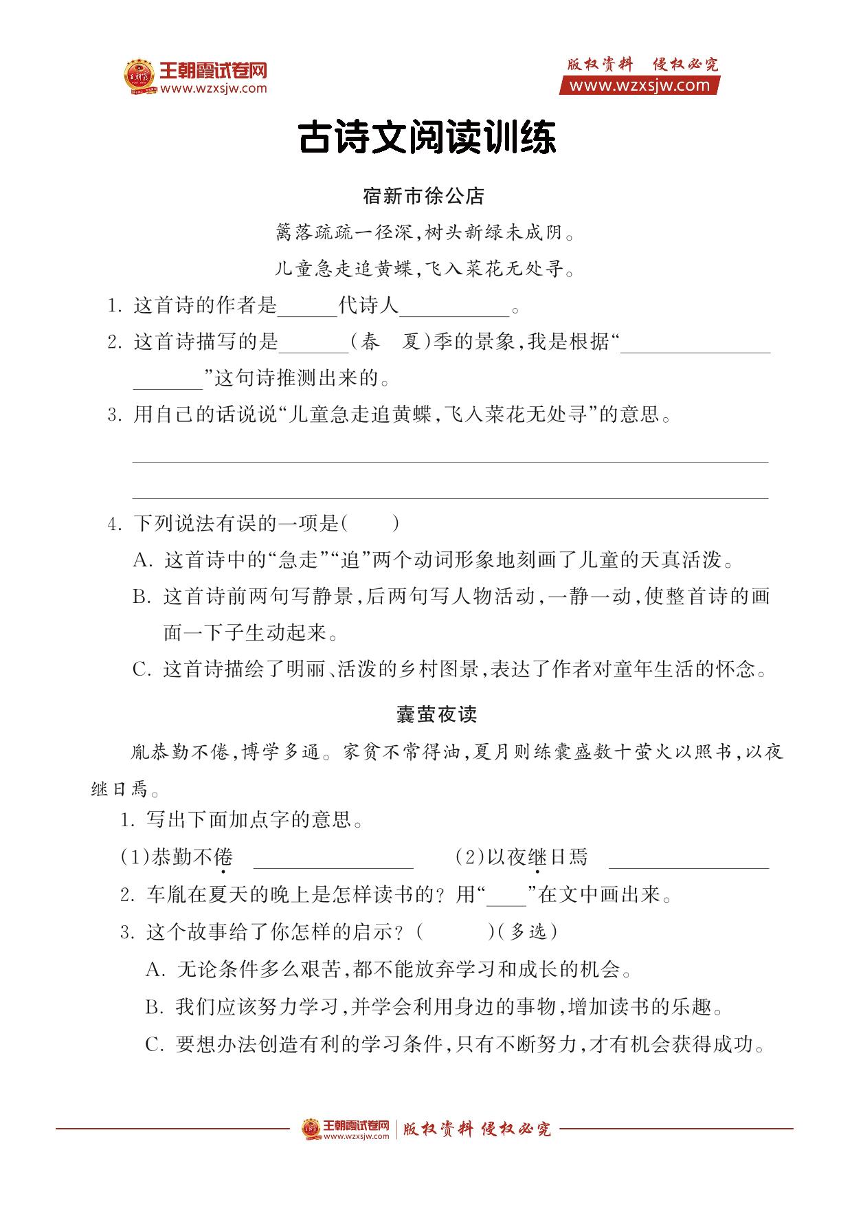 【语文阅读训练·四年级】专项2 古诗文阅读