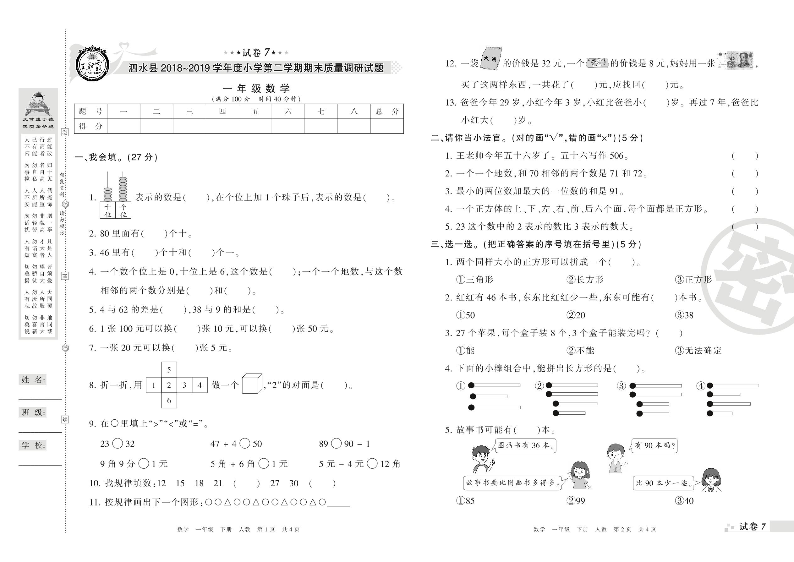 2018-2019学年第二学期济宁市泗水县一年级数学试卷(人教版)【7】