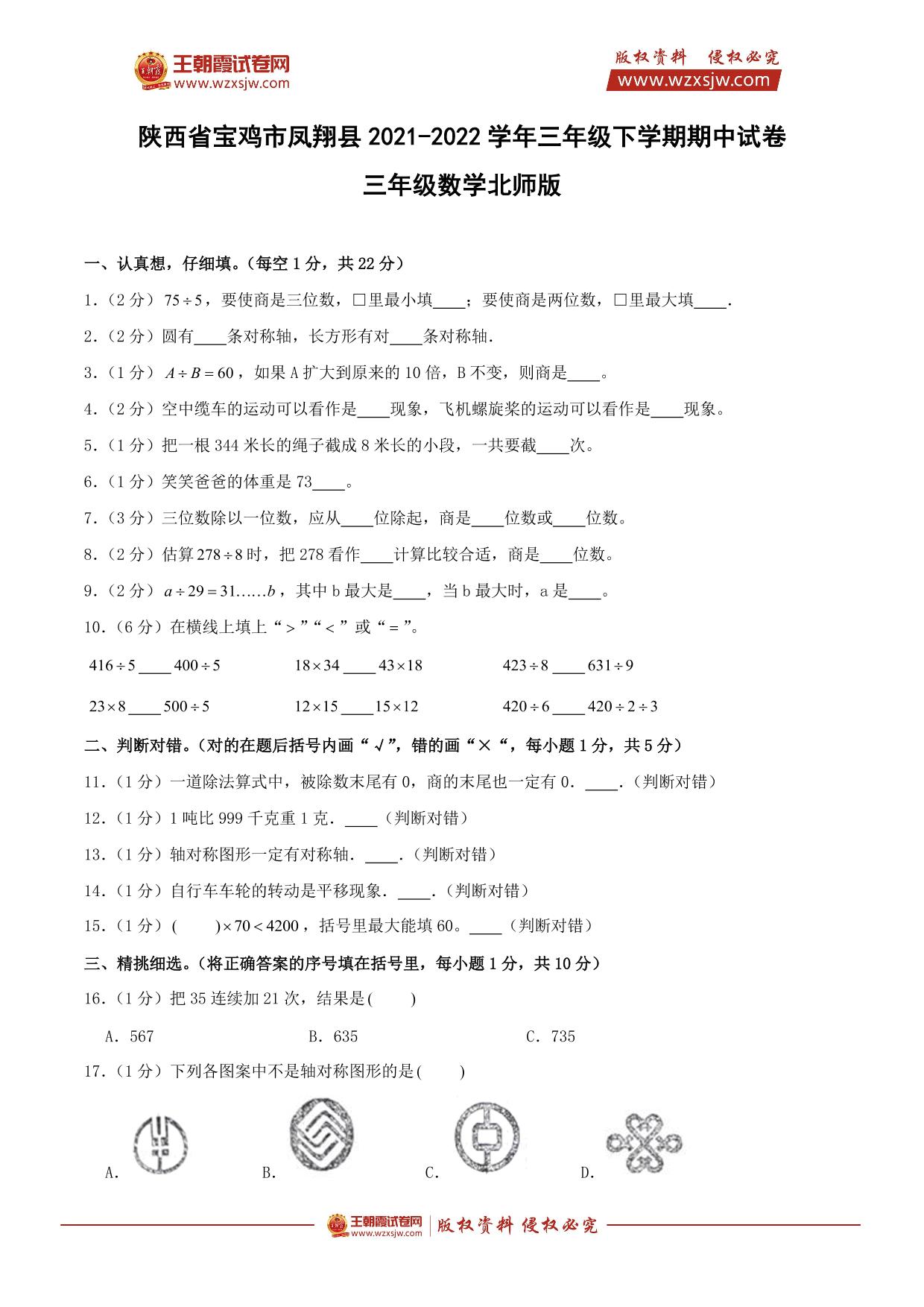 陕西省宝鸡市凤翔县2021-2022学年下学期期中试卷三年级数(北师版)