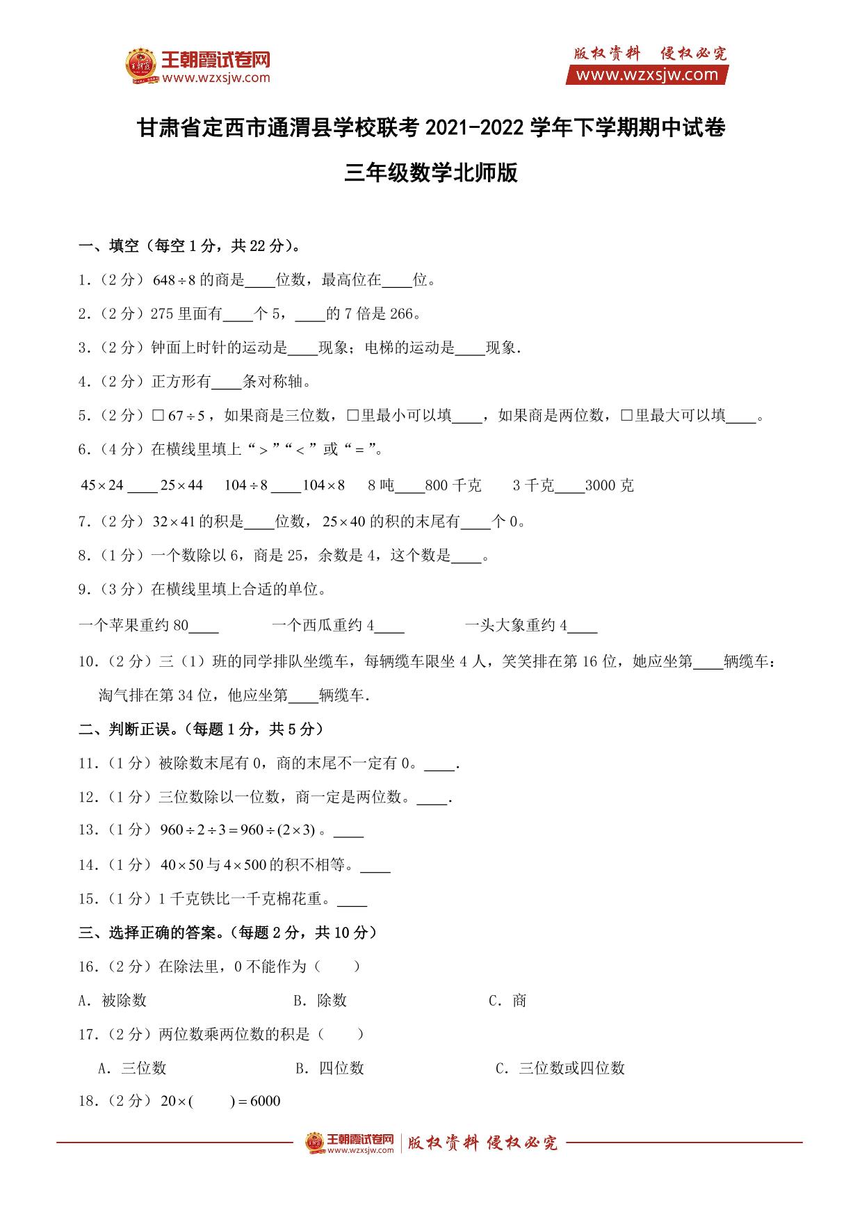 甘肃省定西市通渭县学校联考2021-2022学年下学期期中试卷三年级数学(北师版)