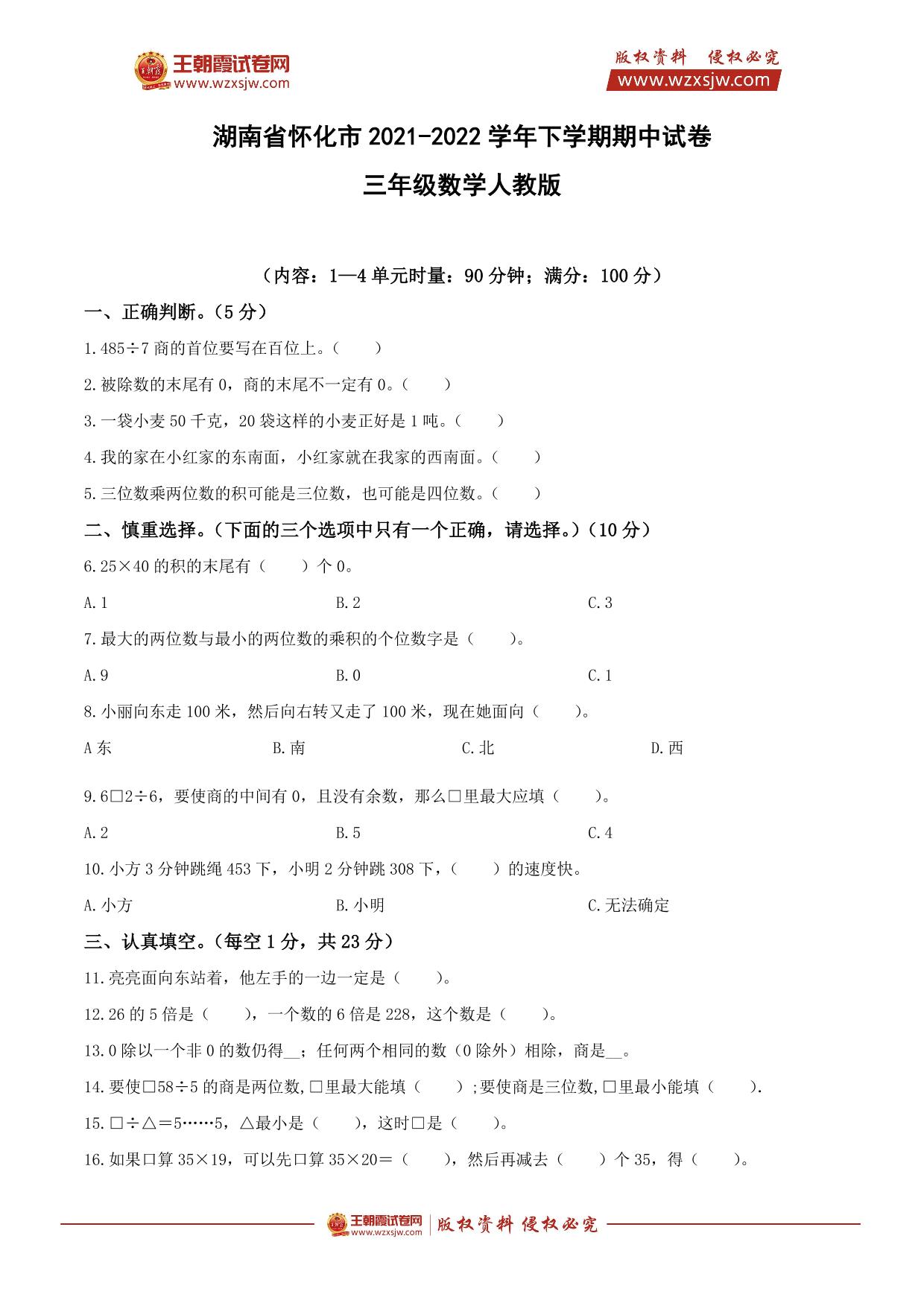 湖南省怀化市2021-2022学年下学期期中试卷三年级数学(人教版)