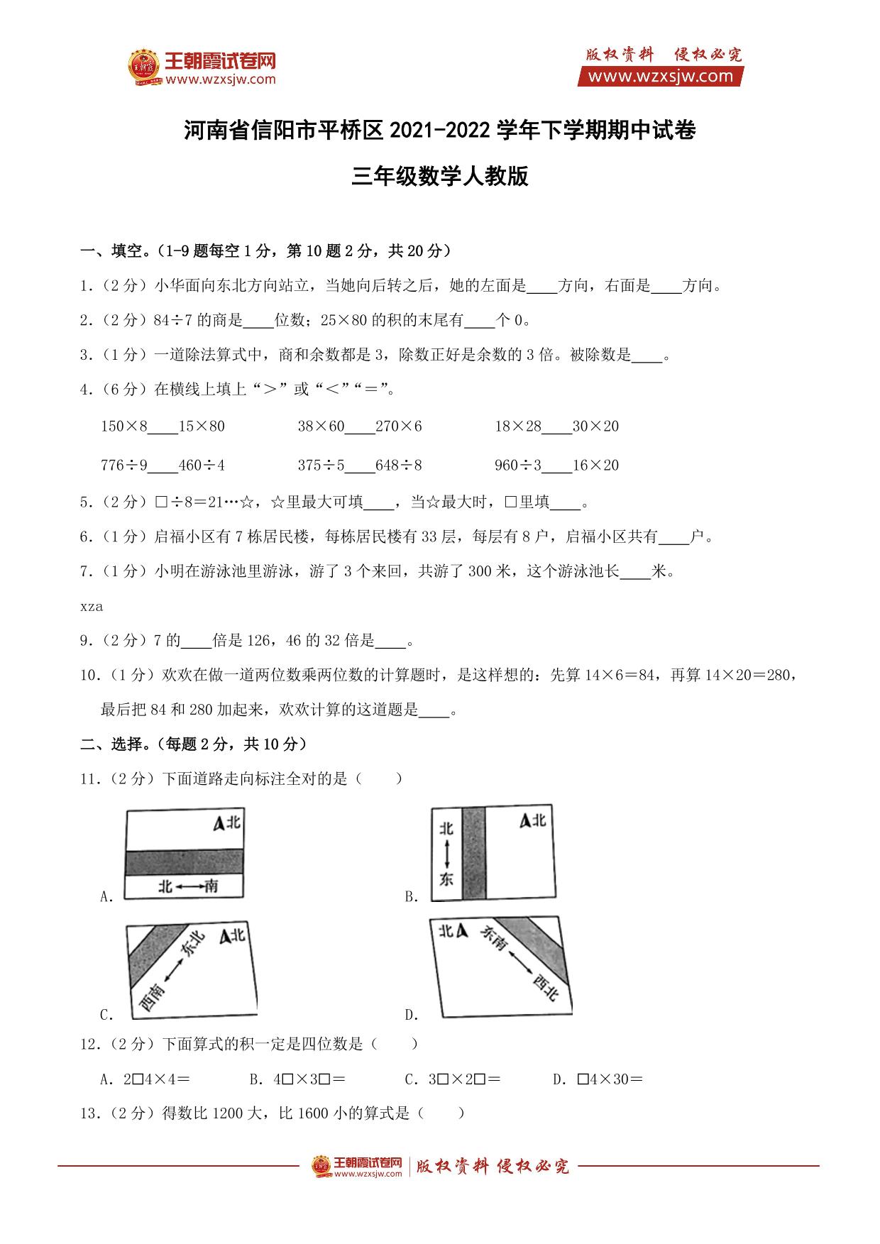 河南省信阳市平桥区2021-2022学年下学期期中试卷三年级数学(人教版)