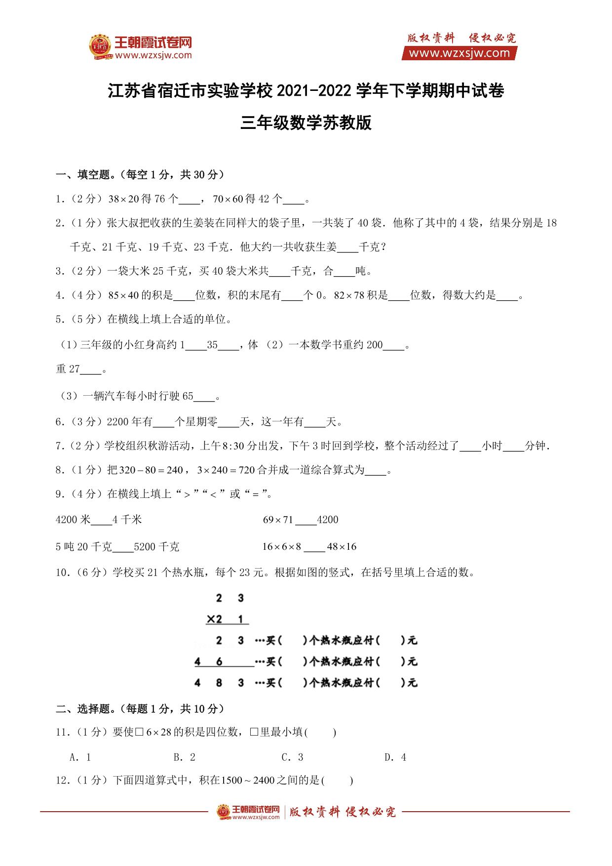 江苏省宿迁市实验学校2021-2022学年下学期期中试卷三年级数学(苏教版)