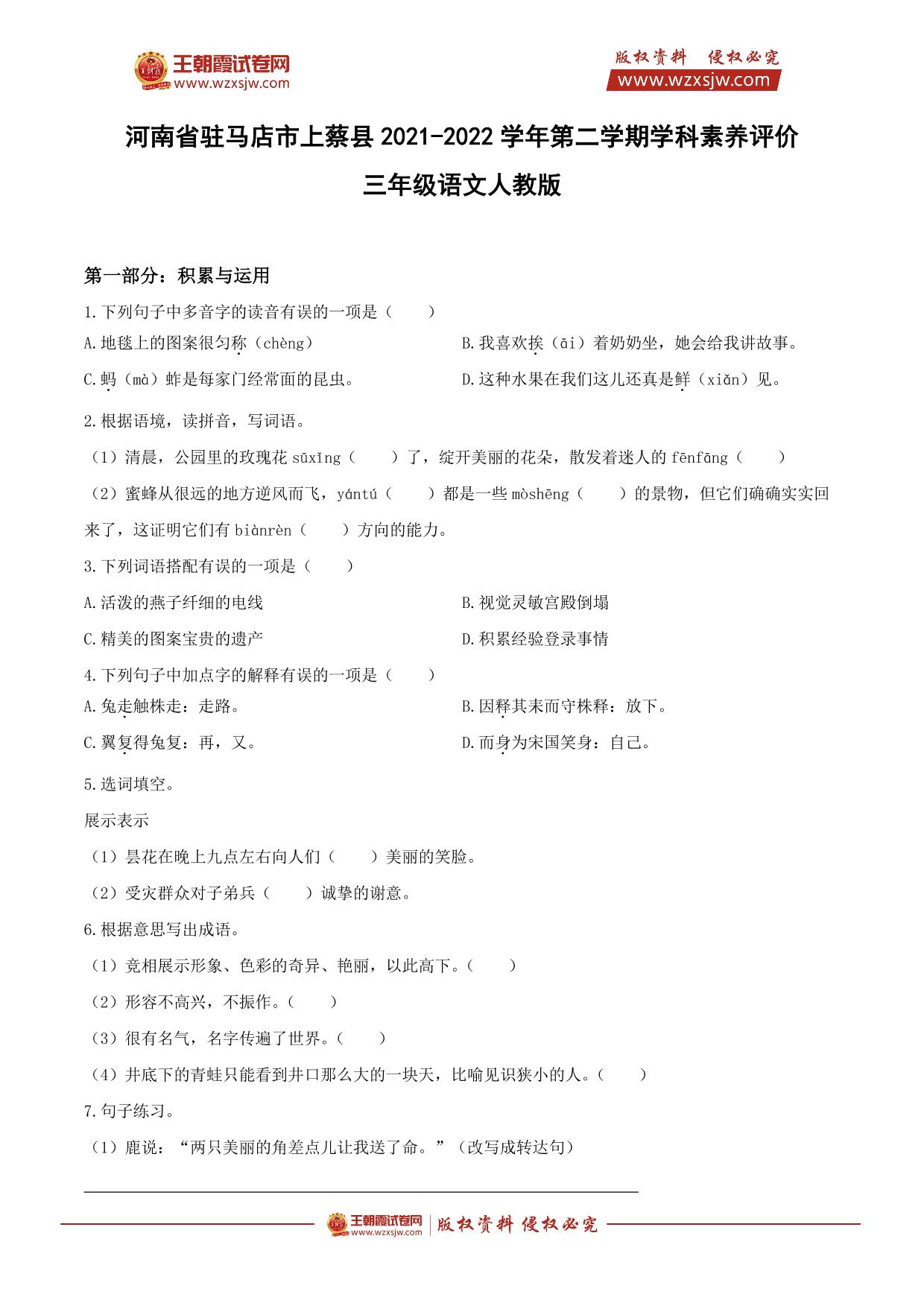 河南省驻马店市上蔡县2021-2022学年第二学期学科素养评价三年级语文(人教版)