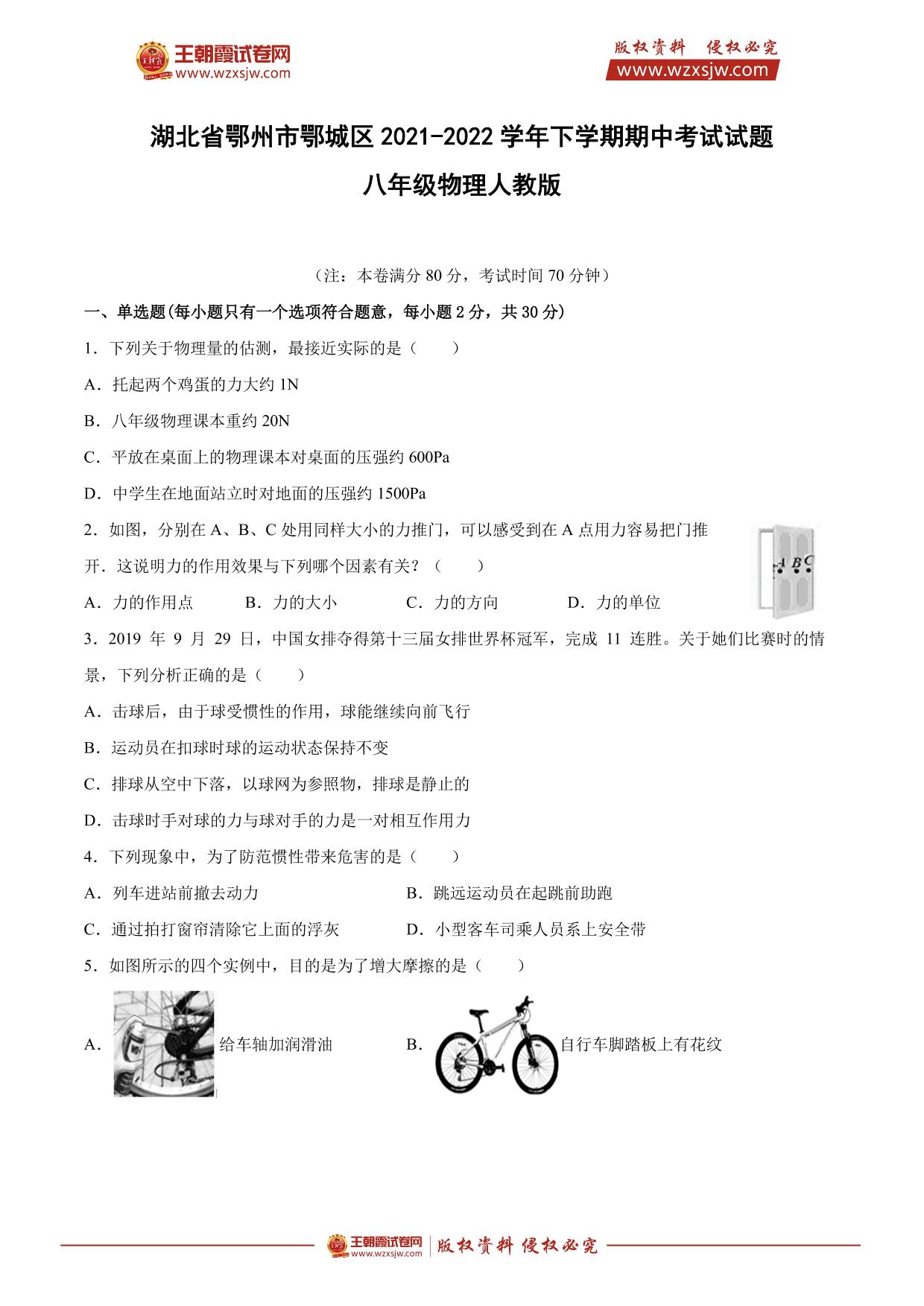 湖北省鄂州市鄂城区2021-2022学年下学期期中考试试题八年级物理(人教版)
