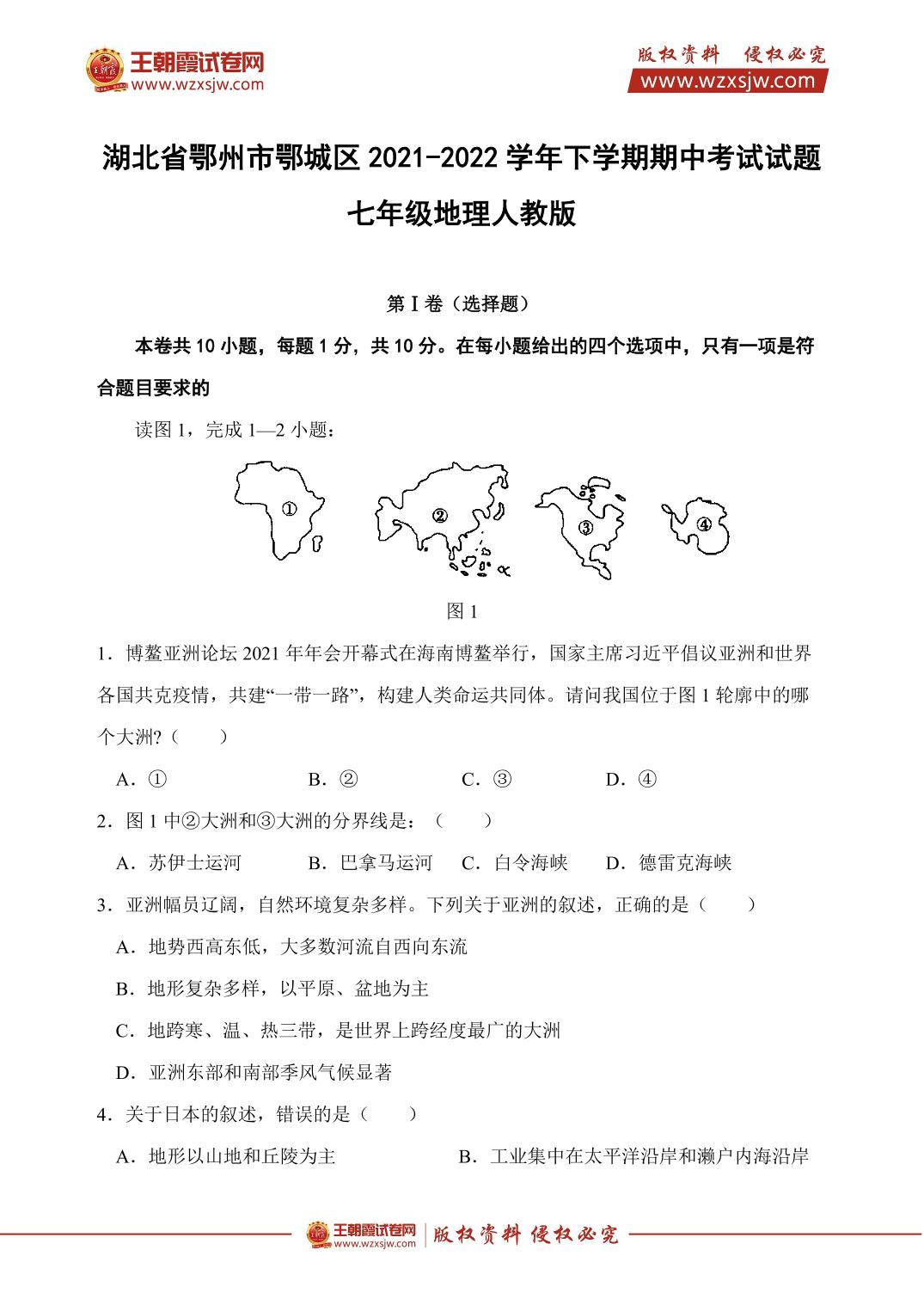 湖北省鄂州市鄂城区2021-2022学年下学期期中考试试题七年级地理(人教版)