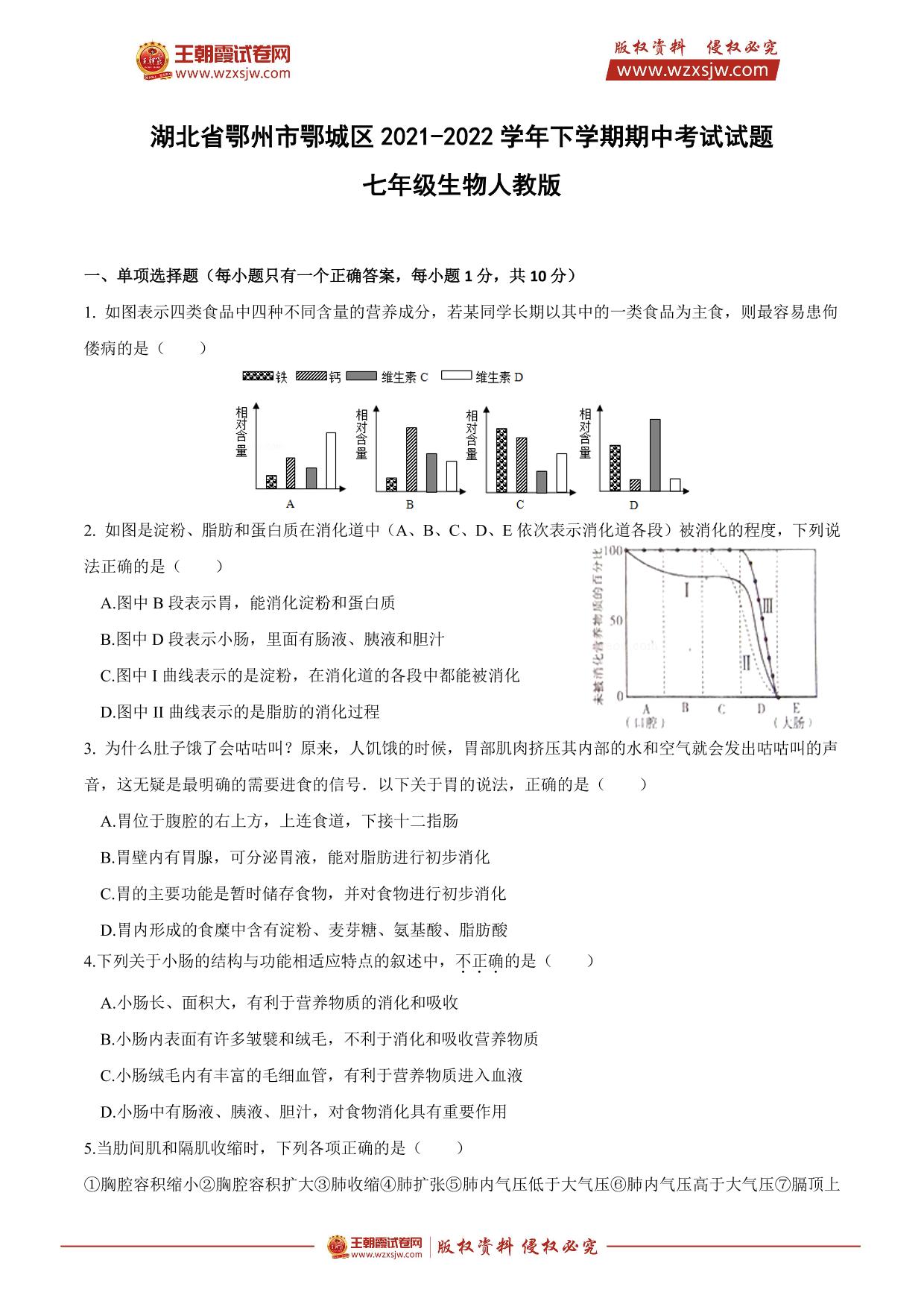 湖北省鄂州市鄂城区2021-2022学年下学期期中考试试题七年级生物(人教版)