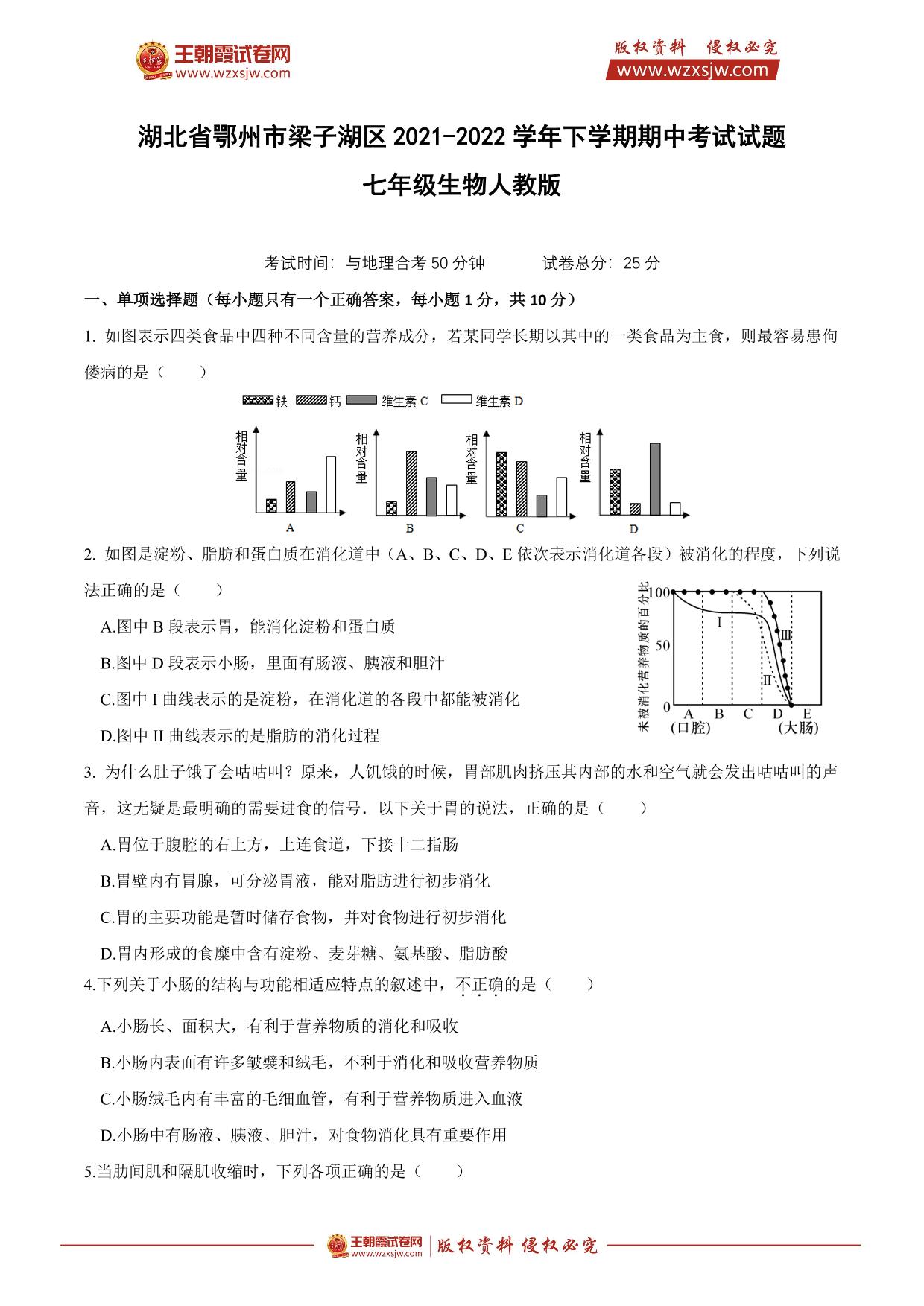 湖北省鄂州市梁子湖区2021-2022学年下学期期中考试试题七年级生物(人教版)