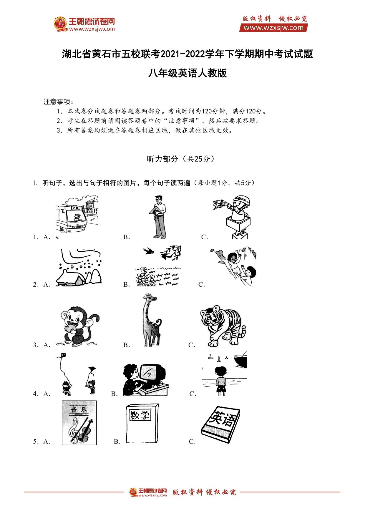 湖北省黄石市五校联考2021-2022学年下学期期中考试试题八年级英语(人教版)【无听力音频】