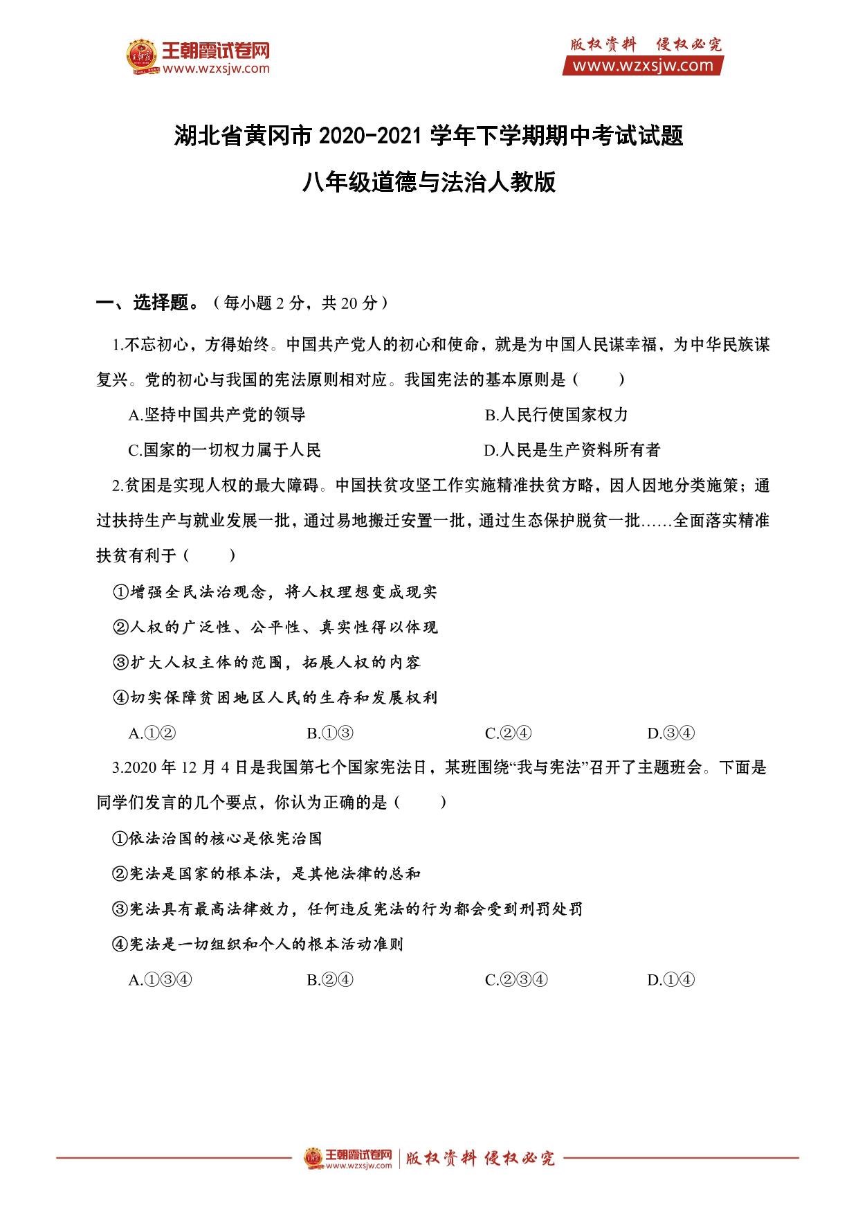 湖北省黄冈市2020-2021学年下学期期中考试试题八年级道德与法治(人教版)