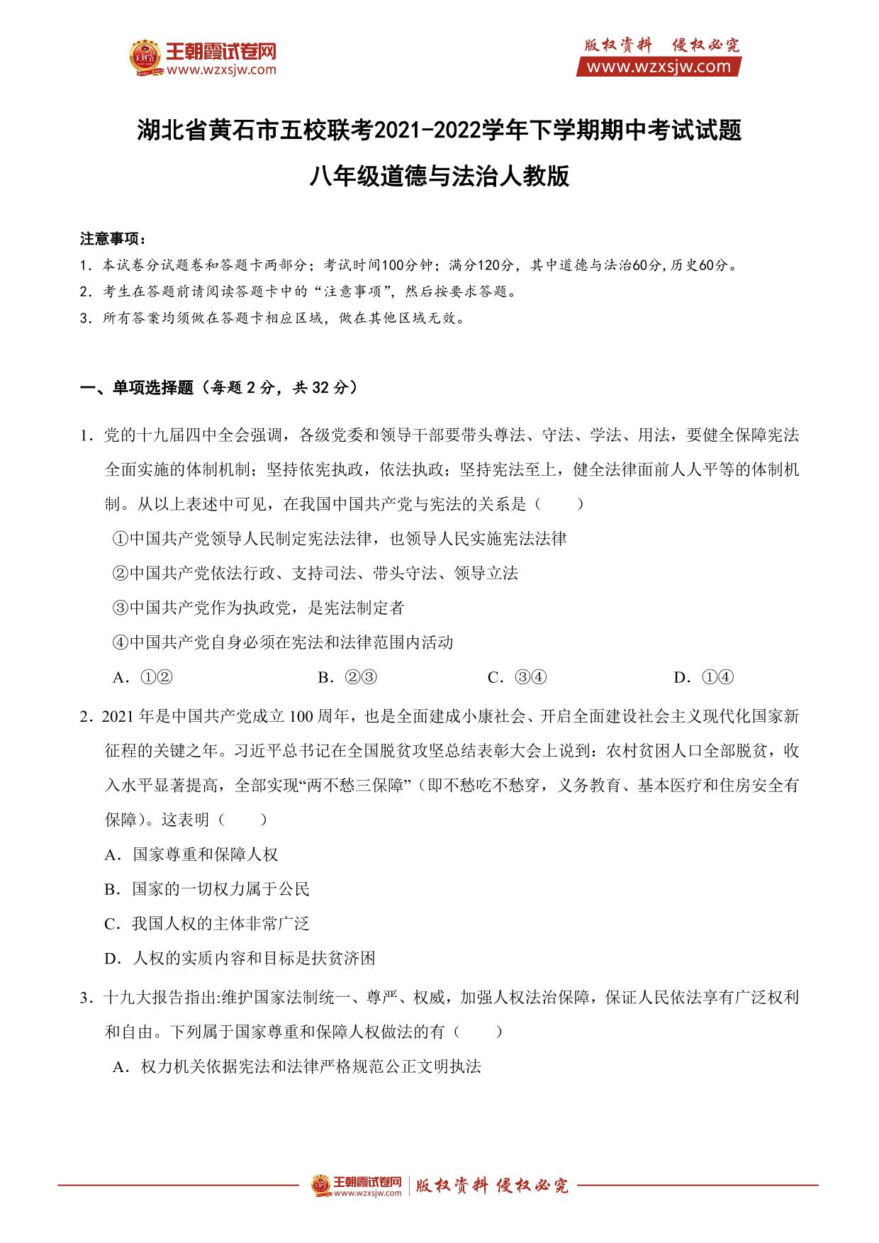 湖北省黄石市五校联考2021-2022学年下学期期中考试试题八年级道德与法治(人教版)