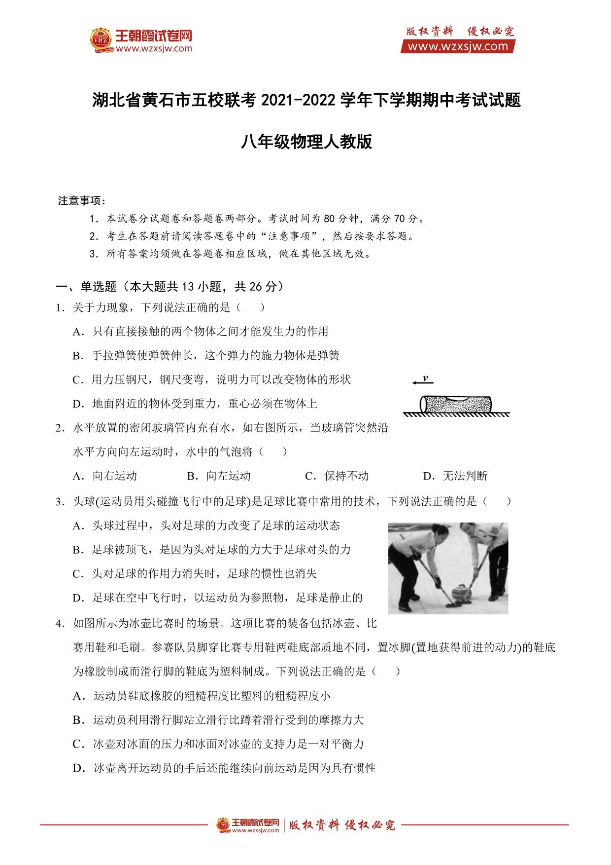 湖北省黄石市五校联考2021-2022学年下学期期中考试试题八年级物理(人教版)