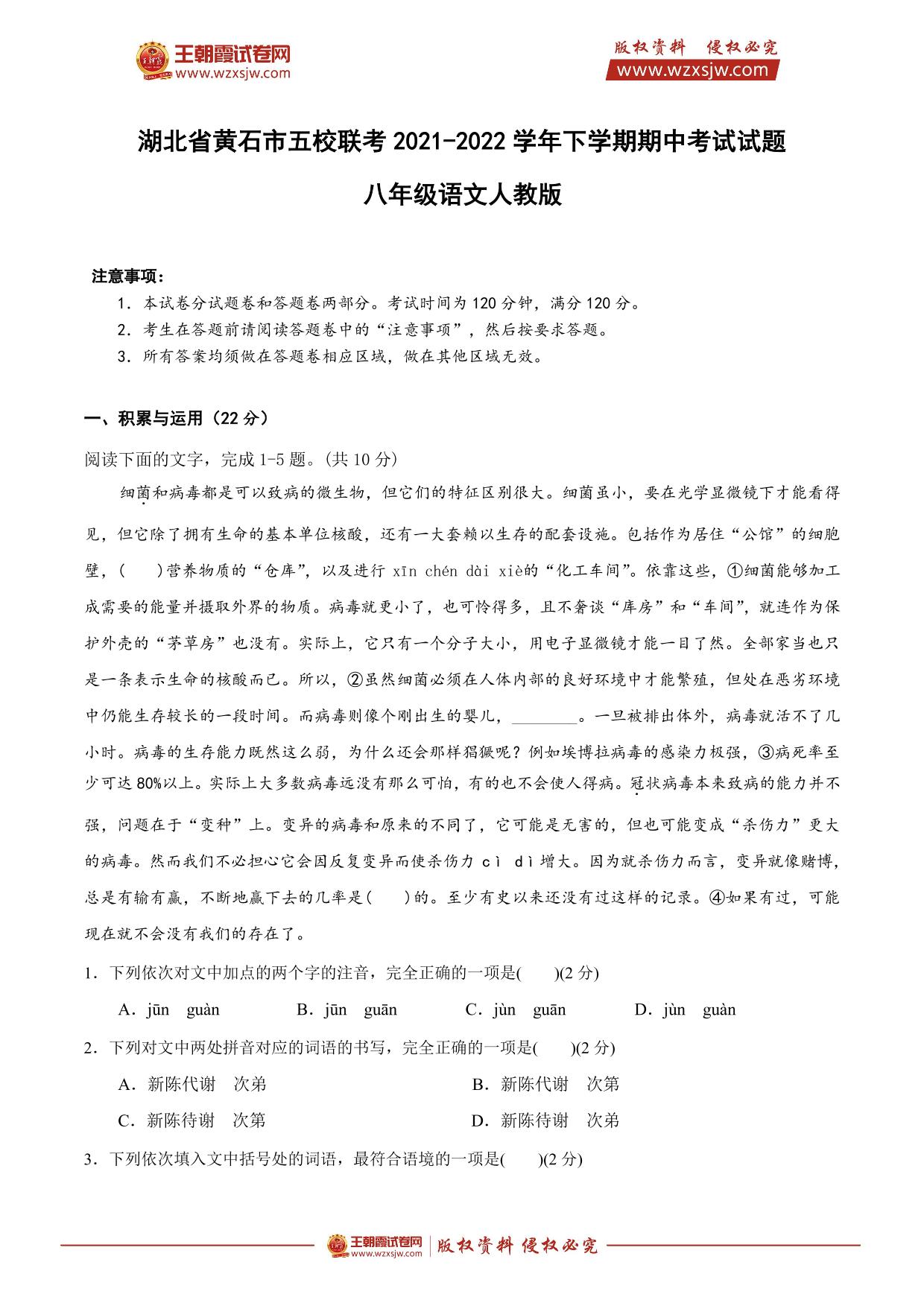 湖北省黄石市五校联考2021-2022学年下学期期中考试试题八年级语文(人教版)