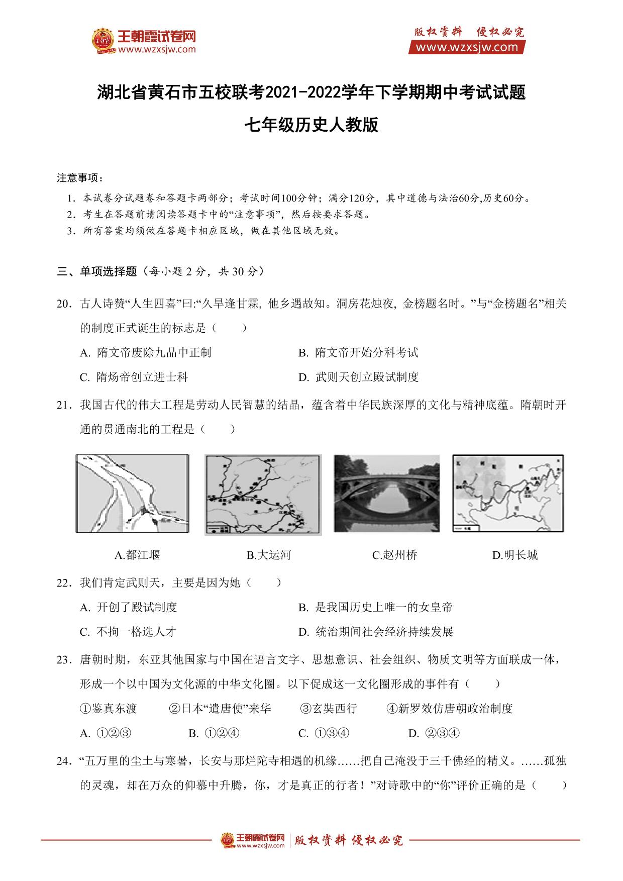 湖北省黄石市五校联考2021-2022学年下学期期中考试试题七年级历史(人教版)