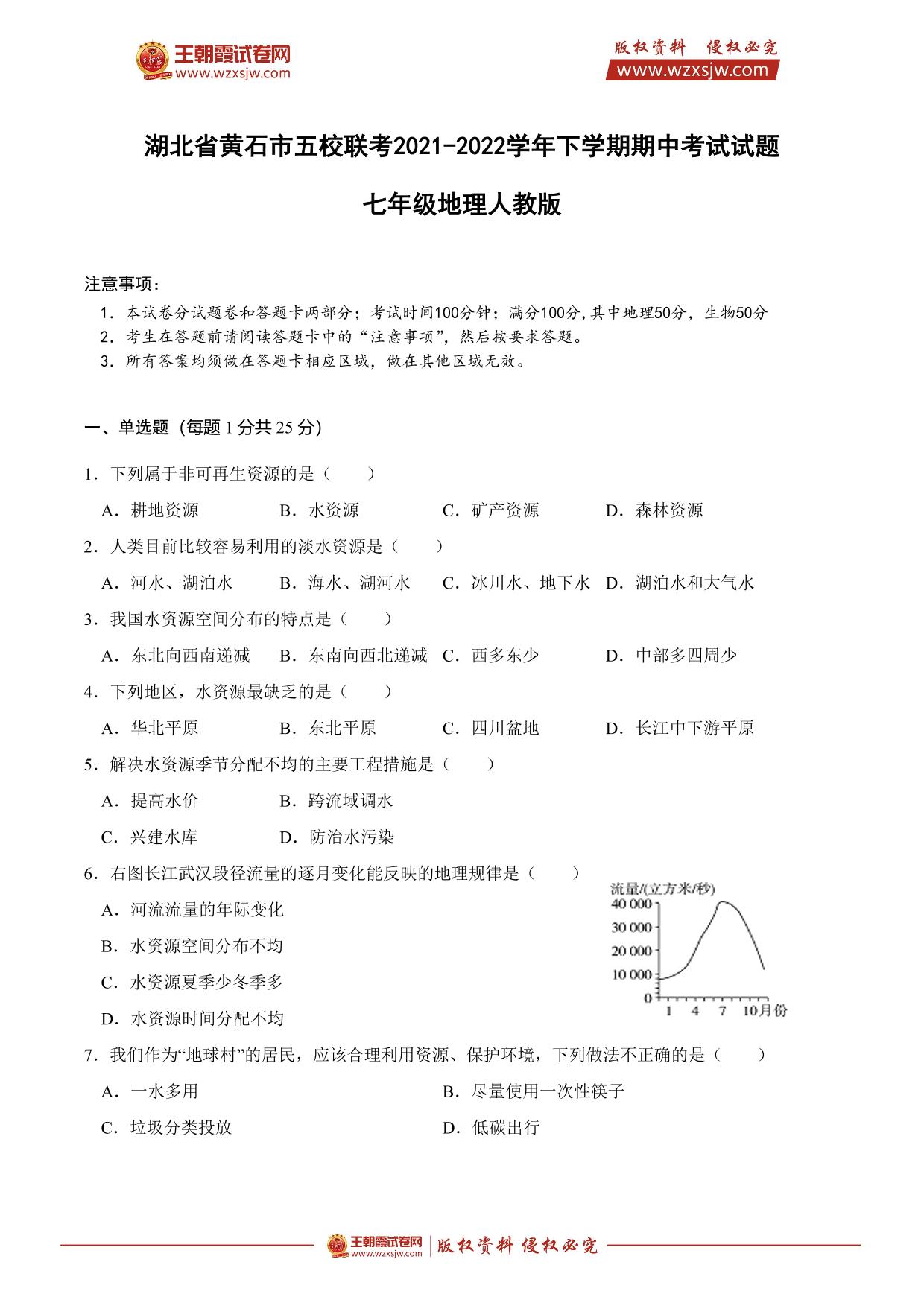 湖北省黄石市五校联考2021-2022学年下学期期中考试试题七年级地理(人教版)