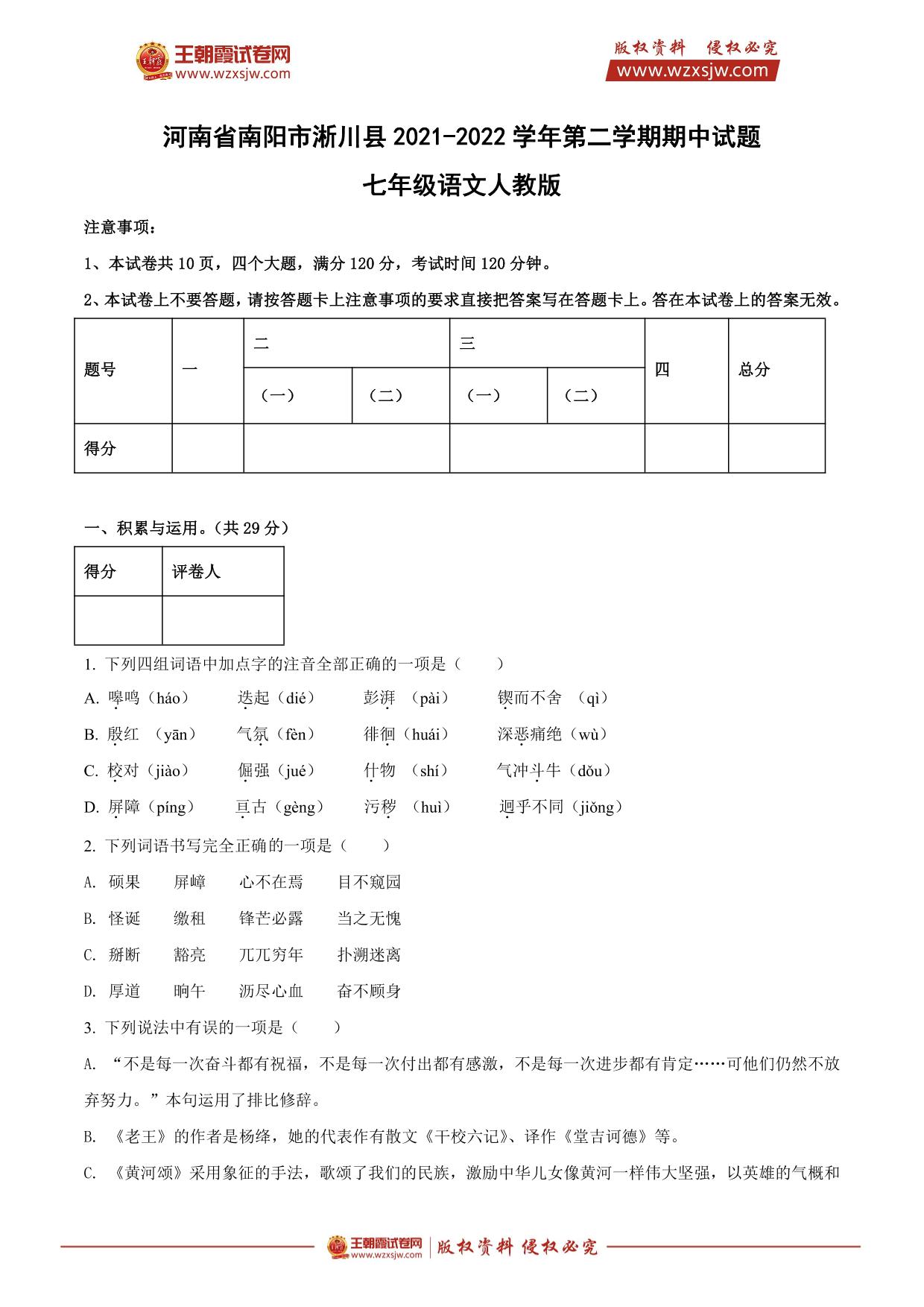 河南省南阳市淅川县2021-2022学年第二学期期中试题七年级语文(人教版)
